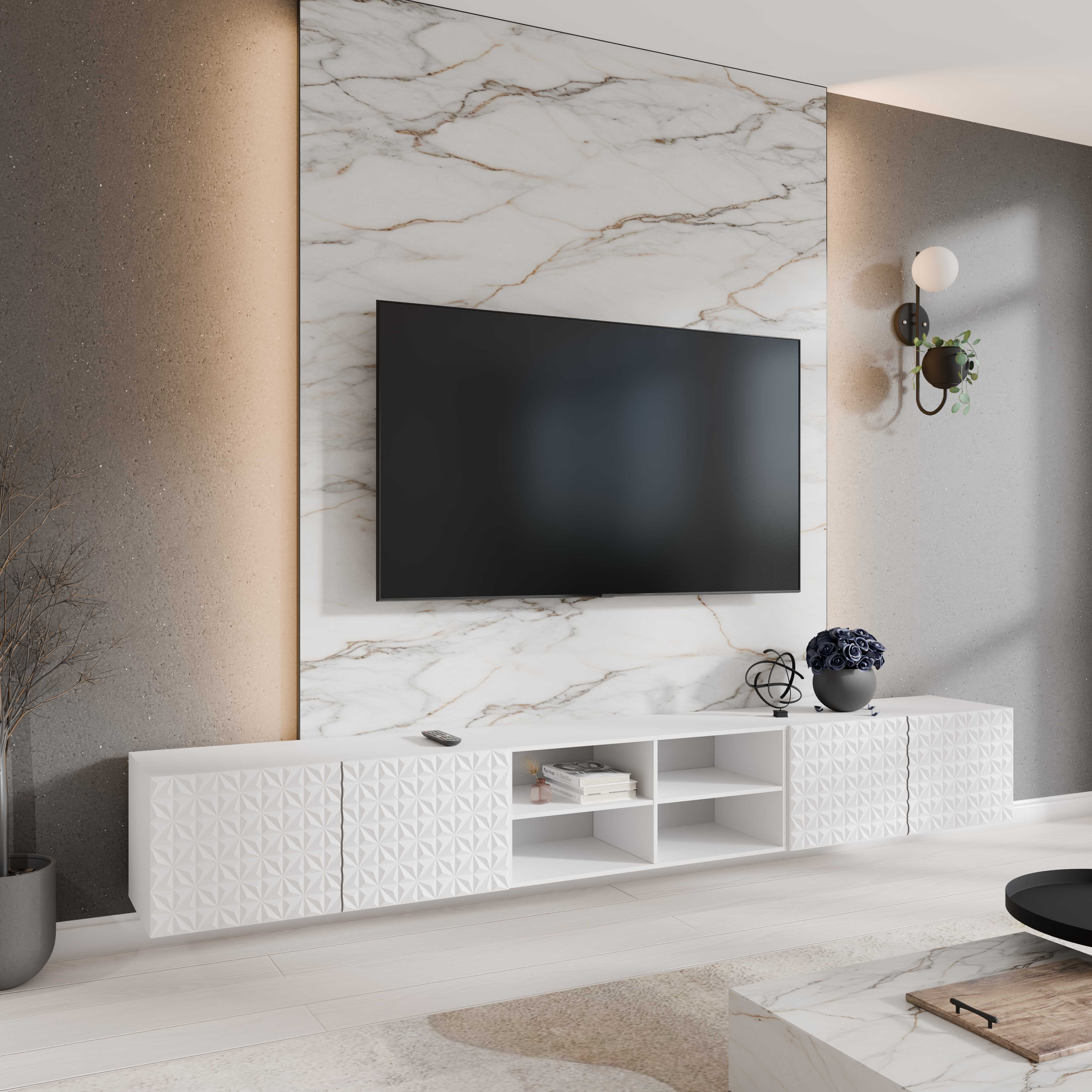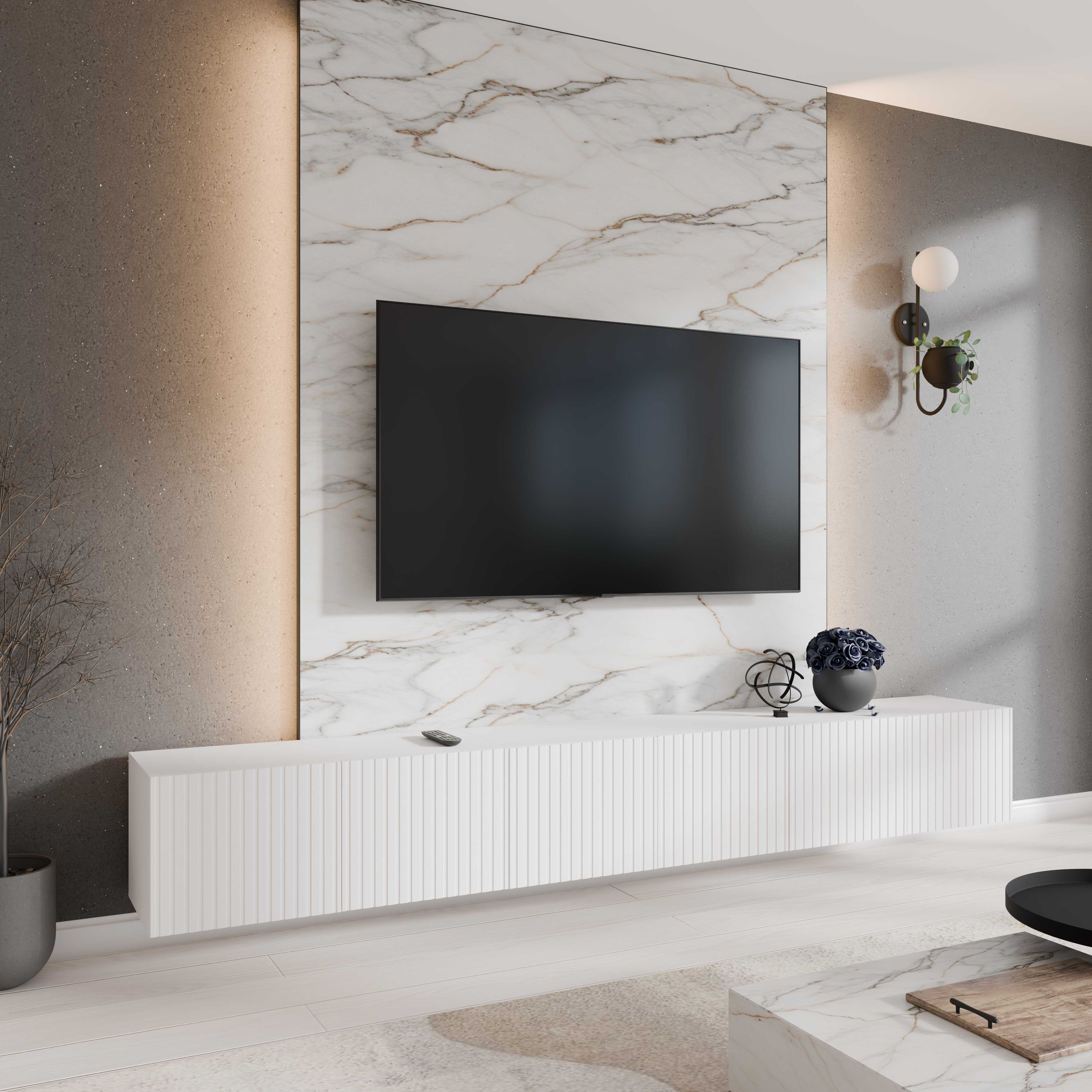 Szafka RTV Wisząca MIO 300 cm biała ryflowana – co ją wyróżnia?