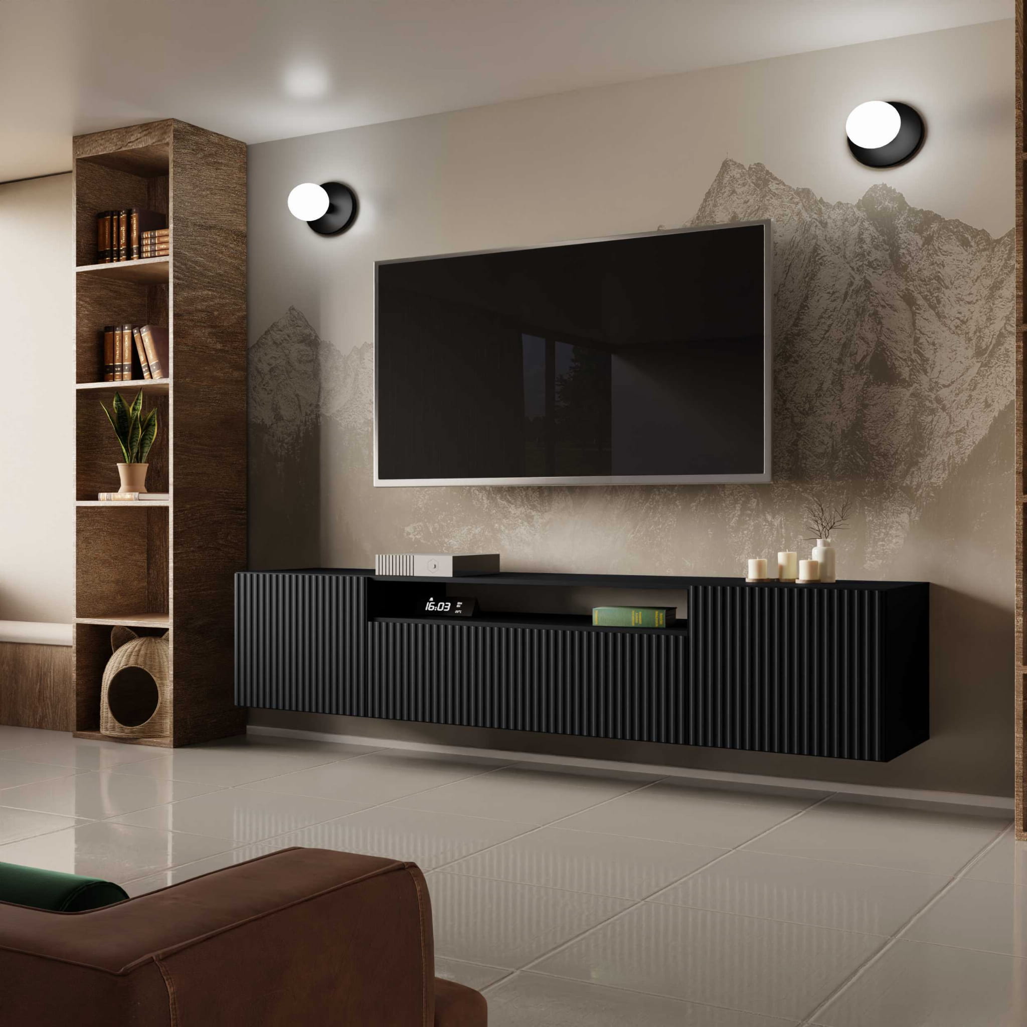 Szafka RTV Wisząca NOE 200 cm czarna ryflowana – dlaczego jest modna?