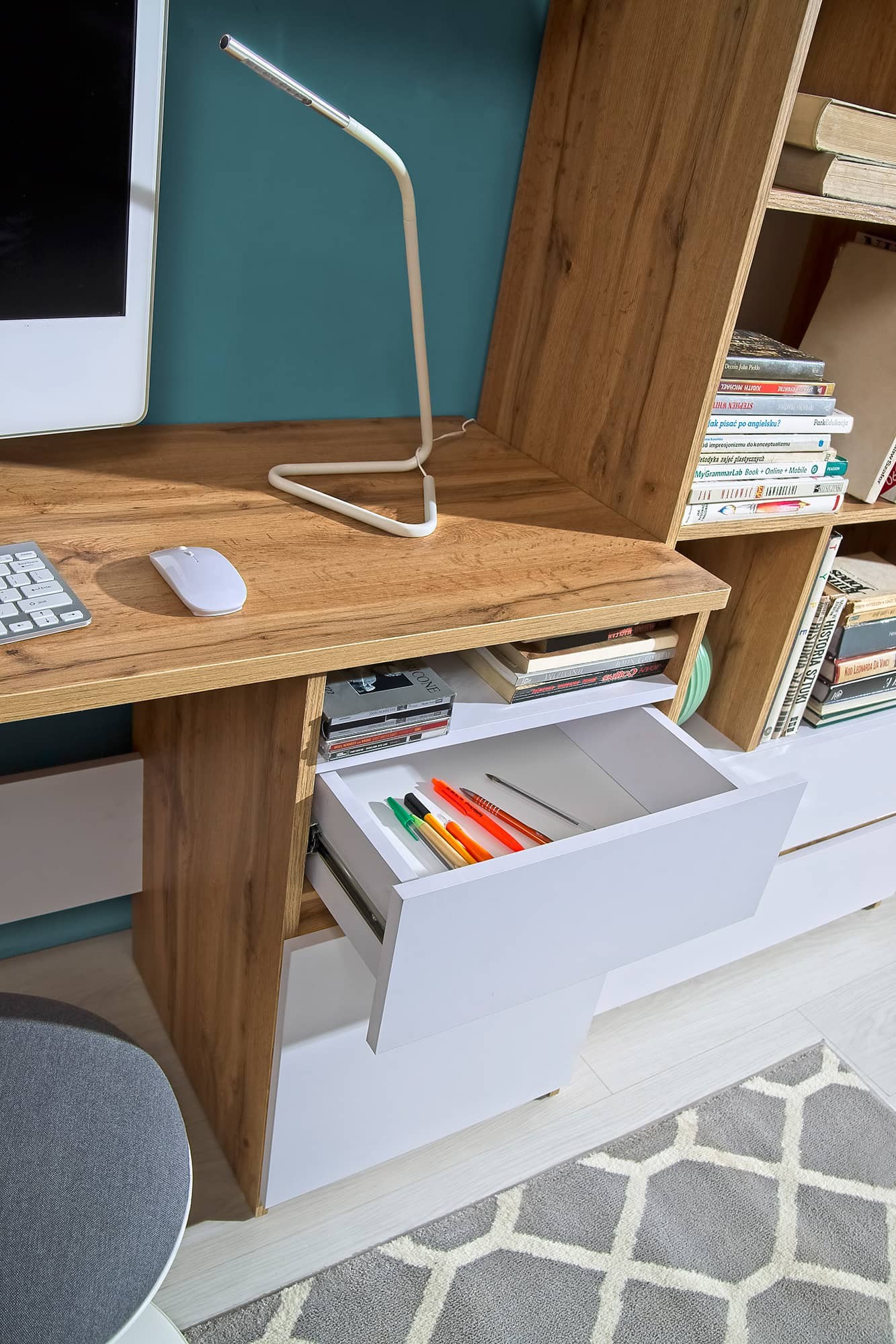 System dostępny jest w całości w modnej bieli lub w połączeniu z płytą dąb wotan.
