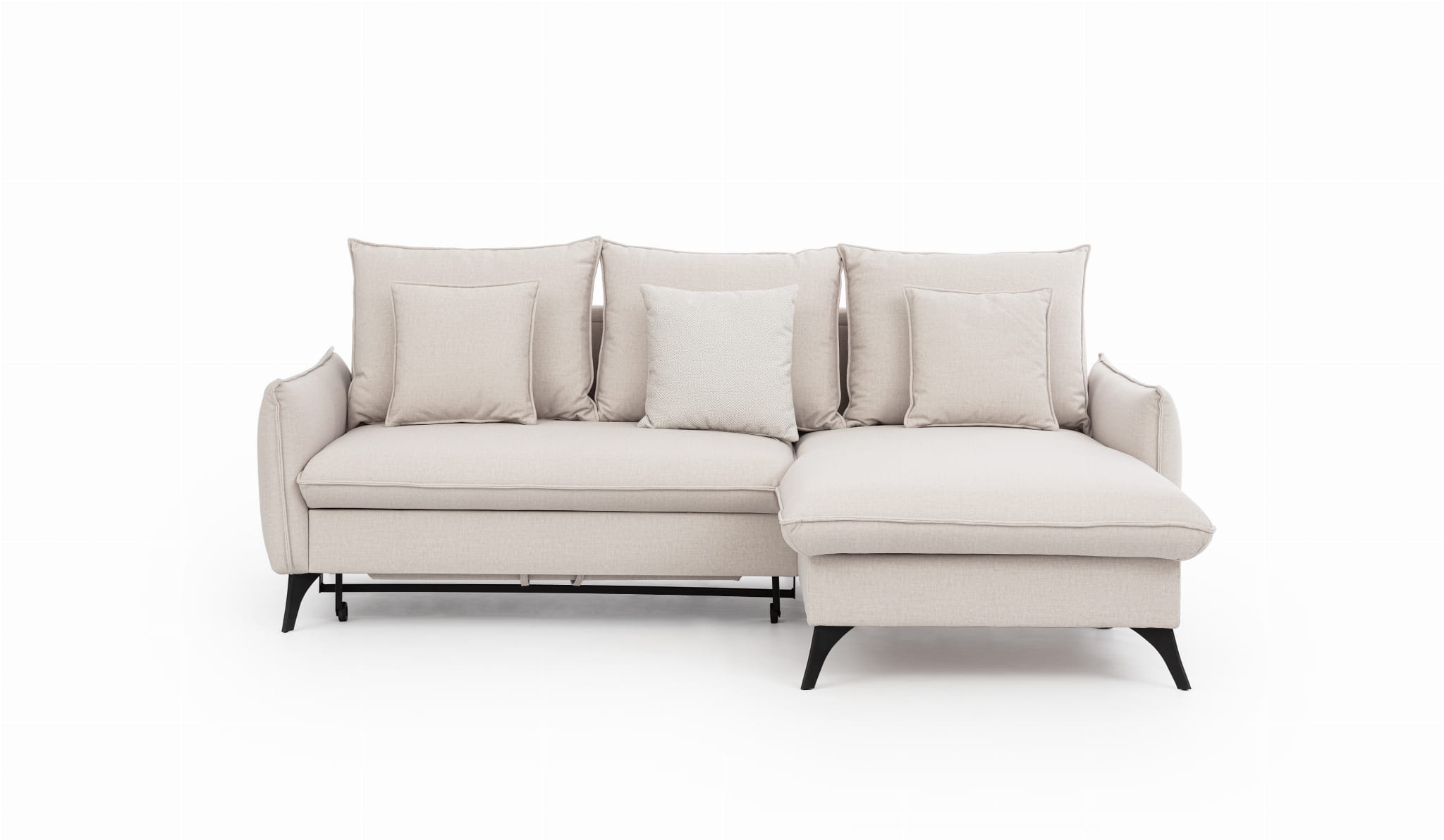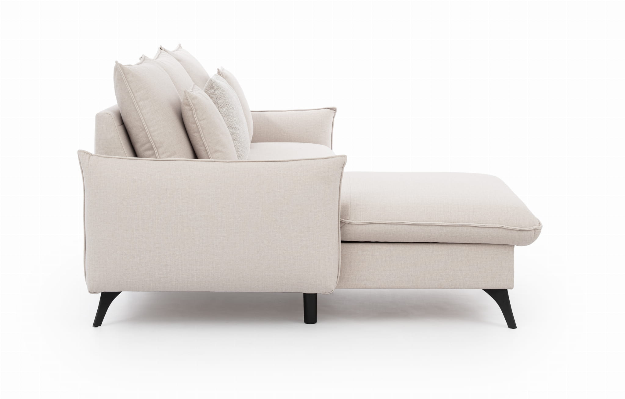 Nowoczesna bryła oparta na czarnych lub srebrnych metalowych nóżkach prezentuje się niezwykle lekko i stabilnie, nie przytłaczając pomieszczenia. Duże poduchy gwarantują miękkość i odpowiednie wsparcie dla pleców, dzięki czemu każda chwila odpoczynku staje się prawdziwą przyjemnością.