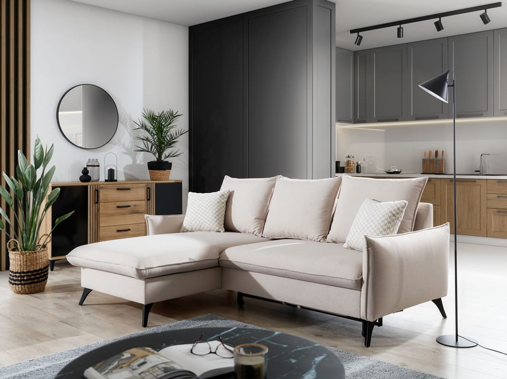 Wybór nowoczesnego narożnika do salonu MODICA to sprawdzony sposób na rozjaśnienie wnętrza i nadanie mu wyjątkowo przytulnego charakteru. Elegancka tkanina doskonale współgra z różnymi stylami aranżacji, tworząc harmonijną przestrzeń do codziennego relaksu dla Ciebie i Twoich bliskich.