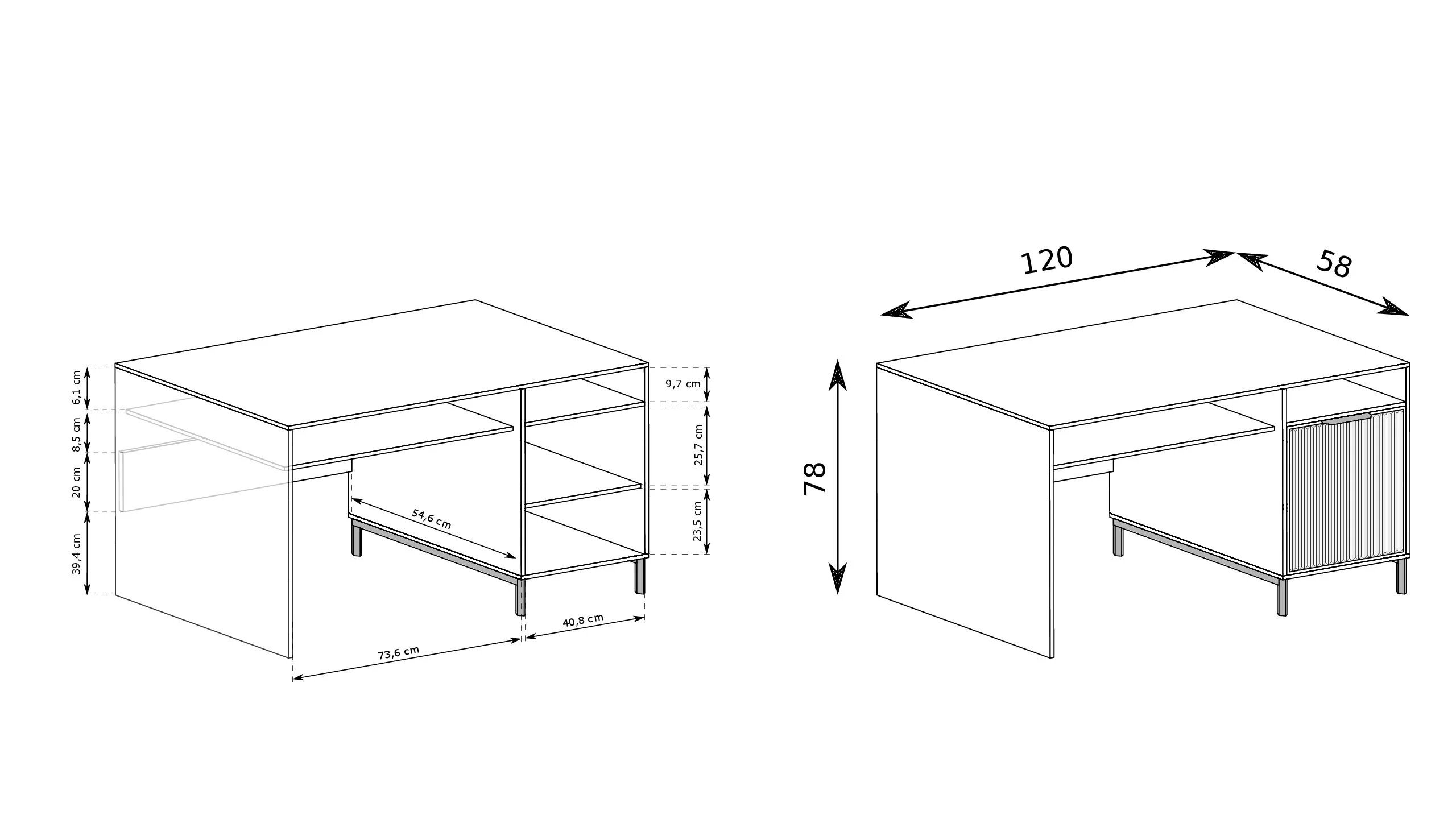 W meblu znajdziemy wysuwaną półkę na klawiaturę od komputera, ale też szafkę po prawej stronie z półką, która dzieli nam przestrzeń na dwie odrębne części.