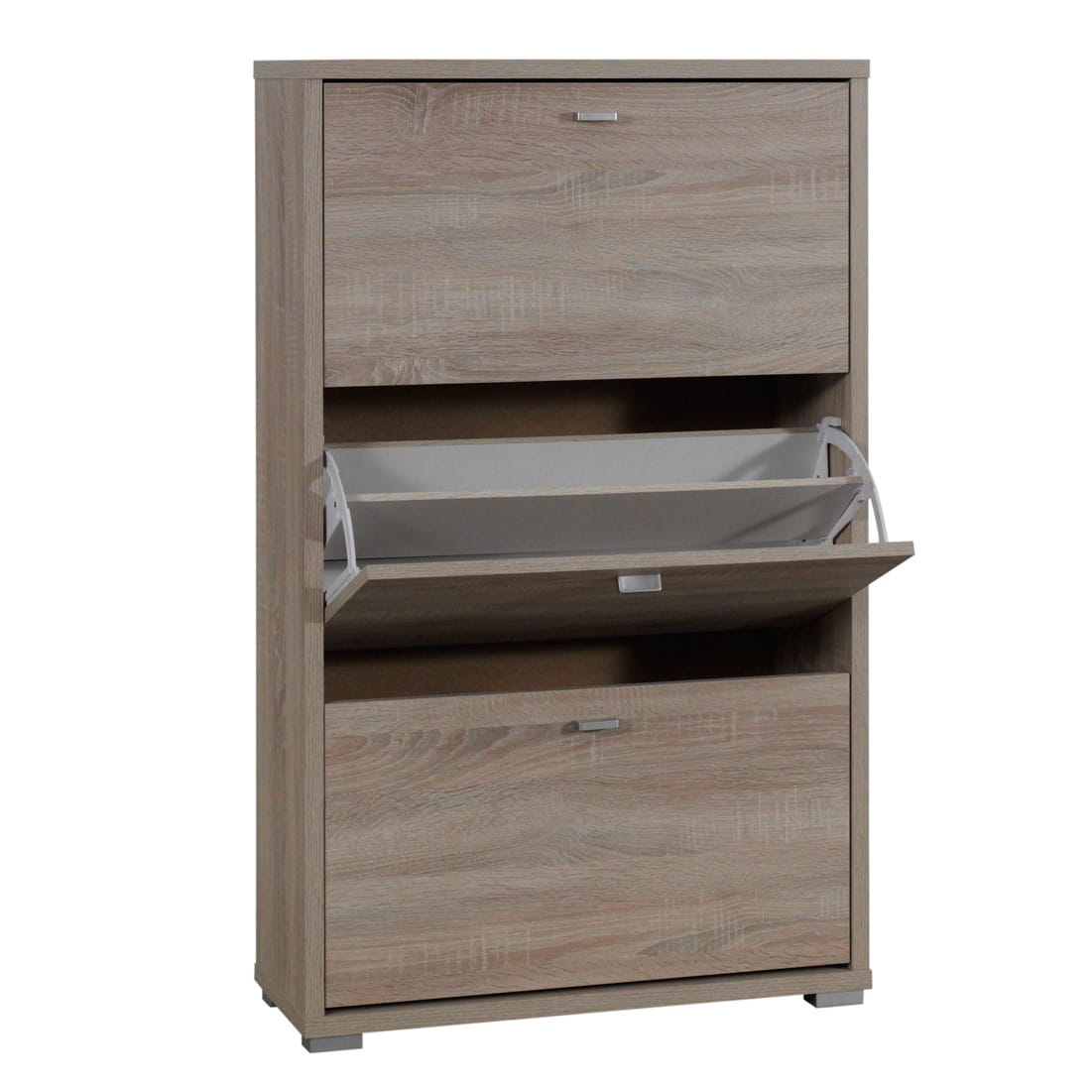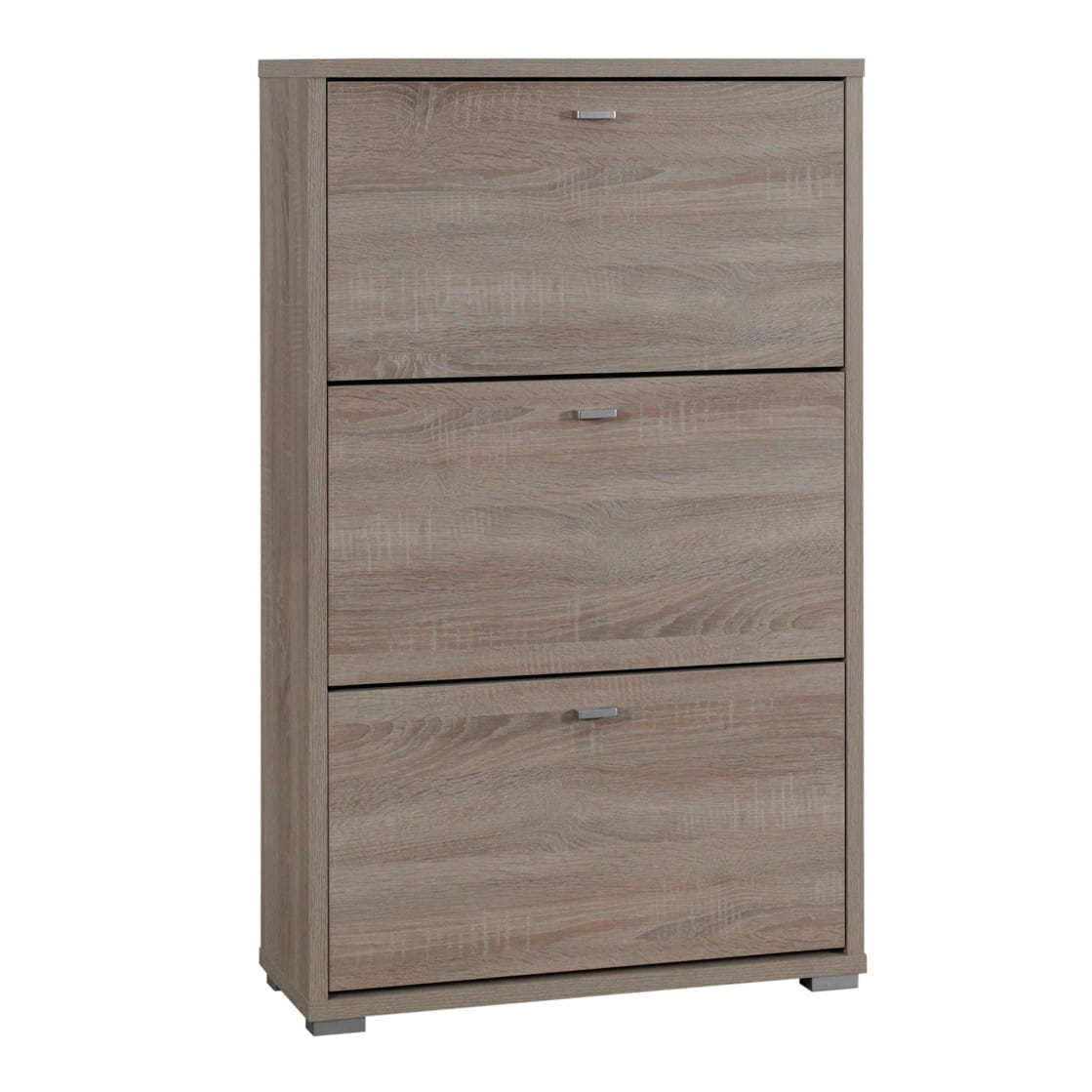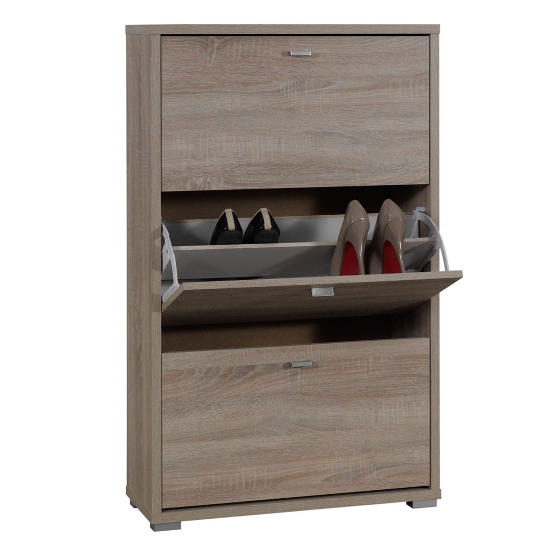 Szafki na buty występują w 3 wariantach wielkościowych oraz trzech kolorach neutralna biel, antracyt oraz klasyczny dąb sonoma.