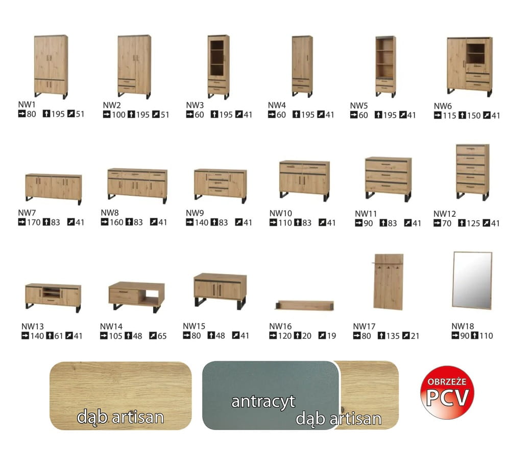 System mebli Newada jest dostępny w dwóch kolorach: dąb artisan oraz antracyt + dąb artisan. Ciepły kolor dekoru dębu artisan wprowadzi do wnętrza przytulny klimat i jest dedykowany dla osób, które szukają mebli w kolorze drewna . Połączenie szarości i dekoru drewna to niebanalna kompozycja – meble będą świetnie prezentować się we wnętrzach minimalistycznych, industrialnych.
