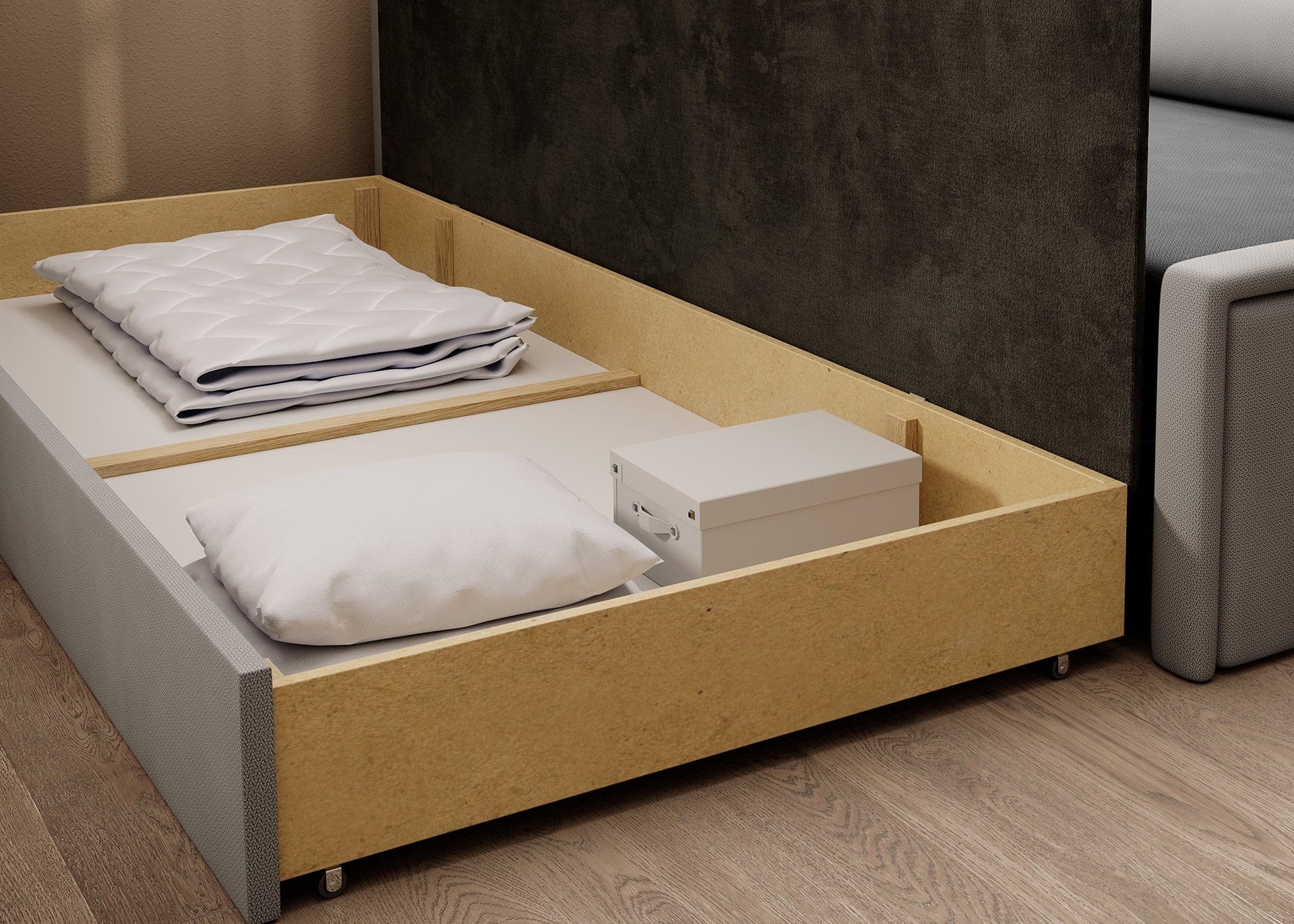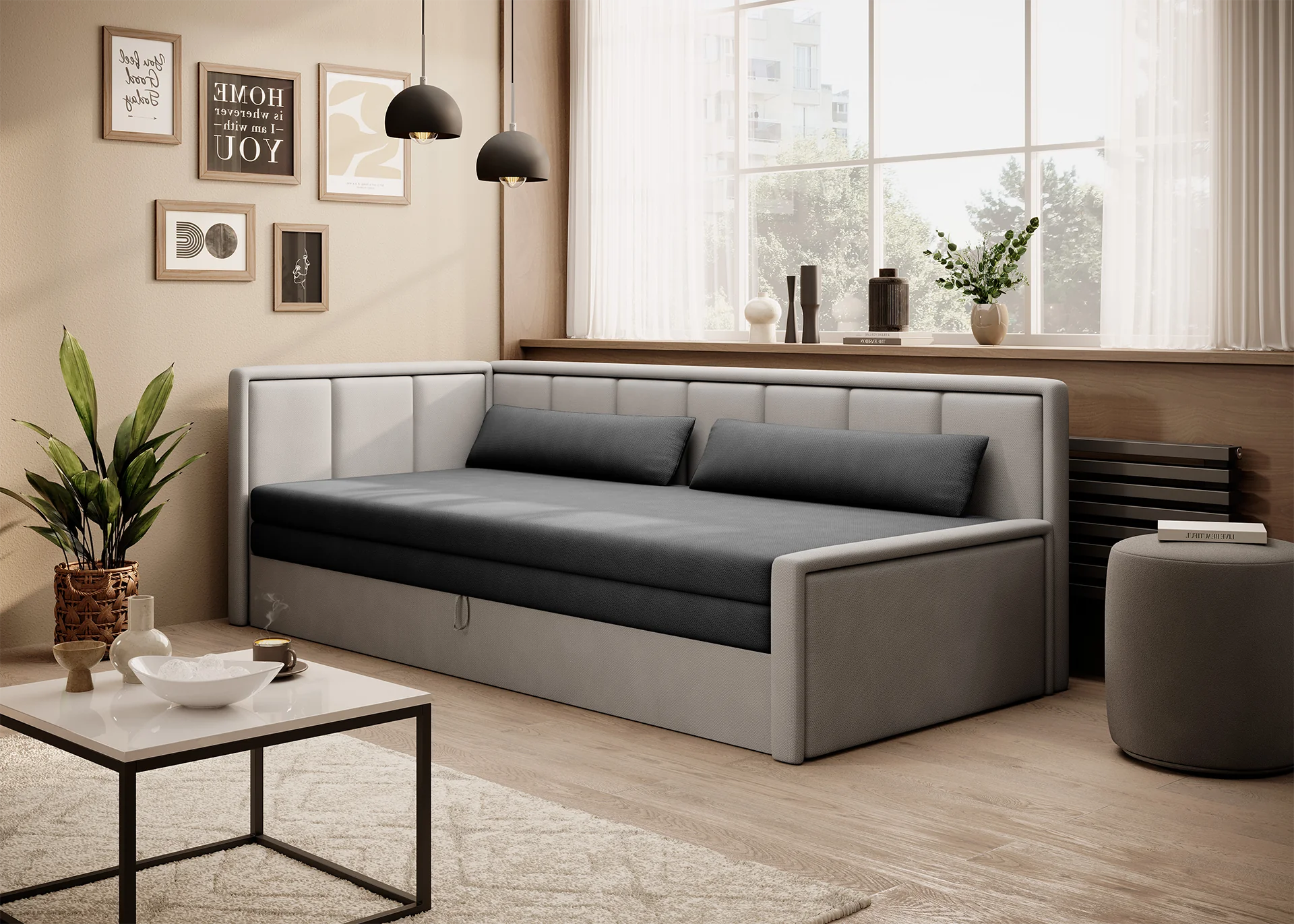 FULGEO to kompaktowa kanapa z funkcją spania, która z łatwością zamienia się w łóżko. Intuicyjny system rozkładania pozwala szybko dostosować mebel do nocnego wypoczynku – zarówno na co dzień, jak i podczas wizyty gości. Dodatkowo, kanapa posiada pojemny schowek na pościel, w którym możesz przechowywać: koce i poduszki, pościel dla gości lub inne akcesoria tekstylne. To funkcjonalność, która naprawdę robi różnicę – szczególnie w małych mieszkaniach, gdzie każdy centymetr przestrzeni jest na wagę złota.