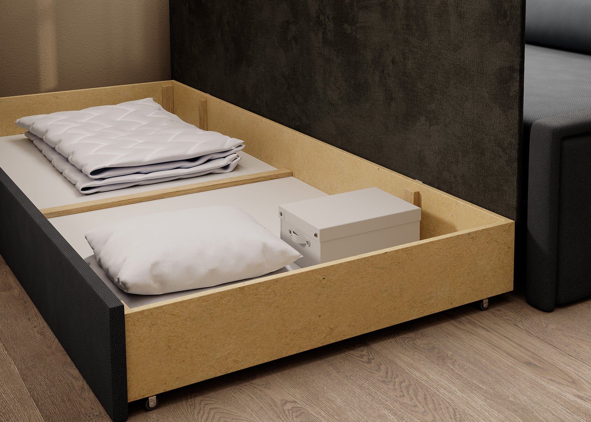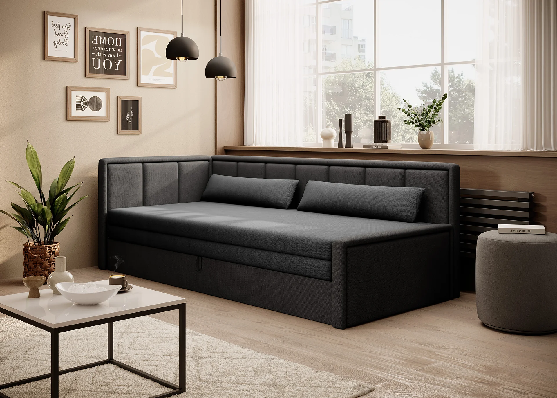FULGEO to kompaktowa kanapa z funkcją spania, która z łatwością zamienia się w łóżko. Intuicyjny system rozkładania pozwala szybko dostosować mebel do nocnego wypoczynku – zarówno na co dzień, jak i podczas wizyty gości. Dodatkowo, kanapa posiada pojemny schowek na pościel, w którym możesz przechowywać: koce i poduszki, pościel dla gości lub inne akcesoria tekstylne. To funkcjonalność, która naprawdę robi różnicę – szczególnie w małych mieszkaniach, gdzie każdy centymetr przestrzeni jest na wagę złota.