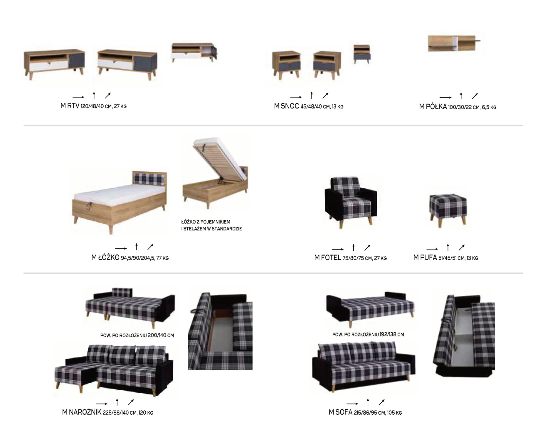 Łóżko wchodzące w skład zestawu dostępne jest w standardzie z solidnym, drewnianym stelażem oraz pojemnikiem na pościel.