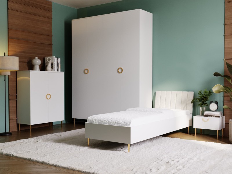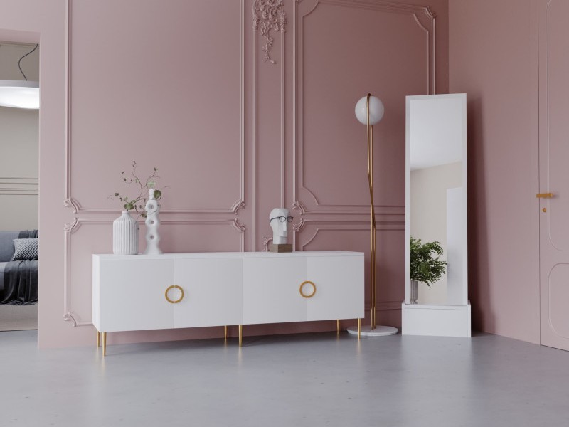 Subtelne, złote detale w postaci metalowych uchwytów i nóg nadają całości luksusowego charakteru, tworząc meble, które przyciągają uwagę i podkreślają elegancję wnętrza. Kolekcja BELLUNA została wykonana z płyty laminowanej 16 mm, co gwarantuje wytrzymałość i odporność na codzienne użytkowanie. To połączenie stylu glamour z praktycznymi rozwiązaniami, które sprawdzą się w nowoczesnym domu.