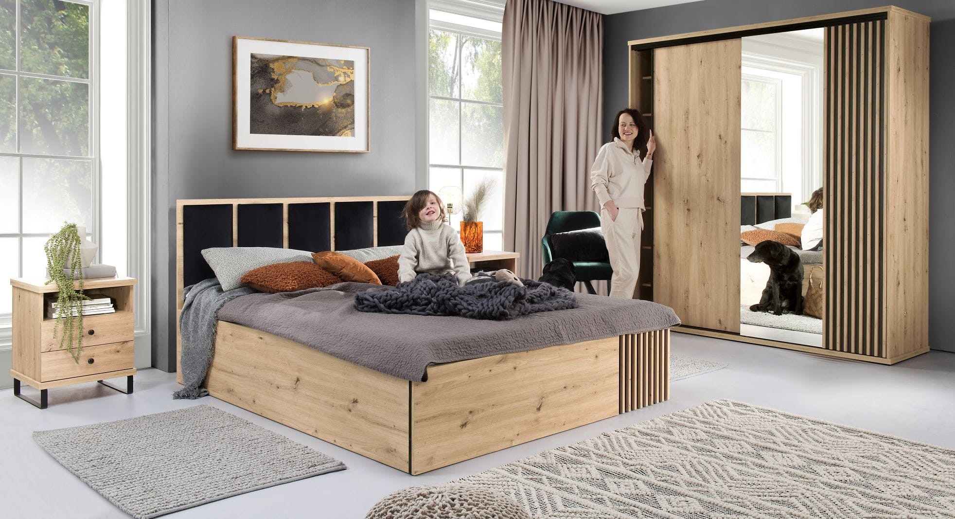 Czarne tło za listwami w postaci modnych lameli w połączeniu z ciemnymi uchwytami tworzy ciekawy wygląda mebla.