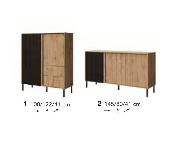 Harmonizujący duet wybarwienia naturalnego drewna z chłodnym czarnym wykończeniem w postaci zdobień na wzór lameli.