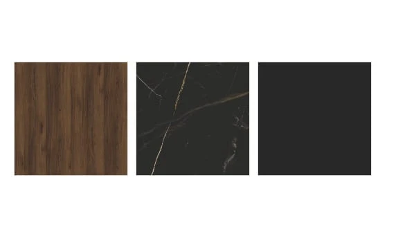 Połączenie ryflowanych frontów w kolorze czarny mat z płytą laminowaną w dekorze orzech i blatów w dekorze marmuru san sebastian nadaje kolekcji niepowtarzalny look i oryginalność wzoru.