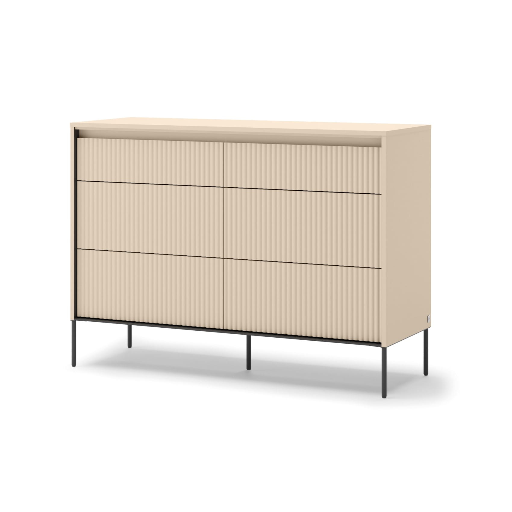Komoda TREND TS-06 Szerokość 130 cm Beż Piaskowy / Czarny 6-Szuflad Oświetlenie LED Ryflowany Front Sypialnia TS6BPC
