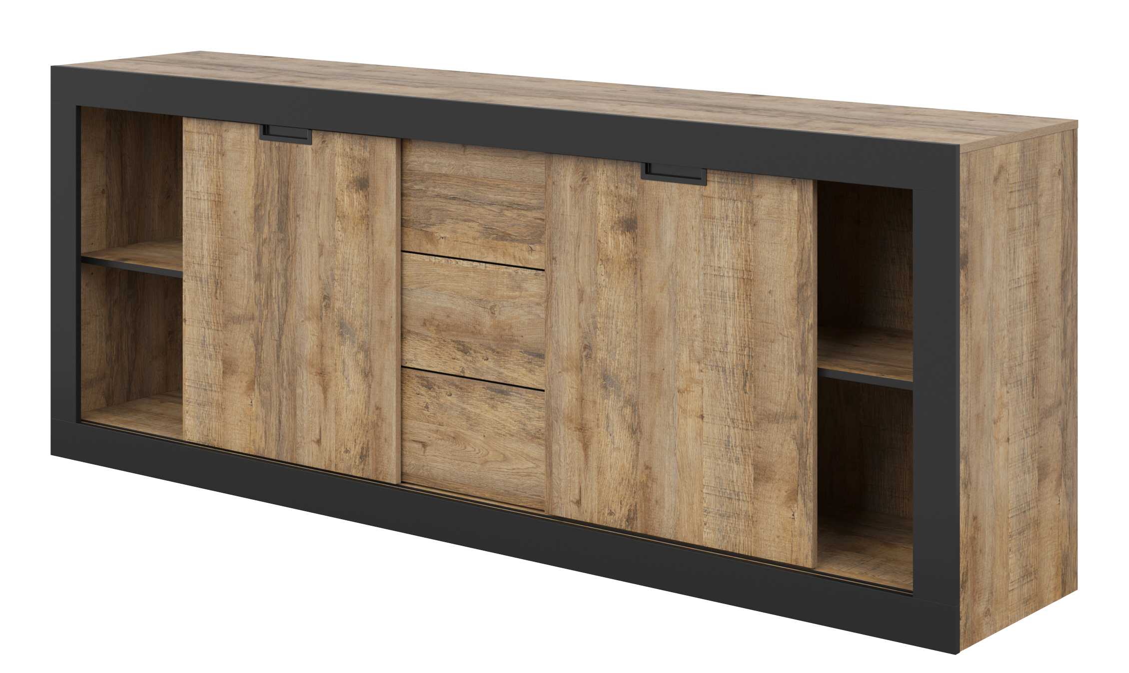 Komoda TUDOR Szerokość 220 cm Dąb Samdal - Czarny Mat Dwudrzwiowa 3-Szuflady Helvetia Meble 24WSNZ25