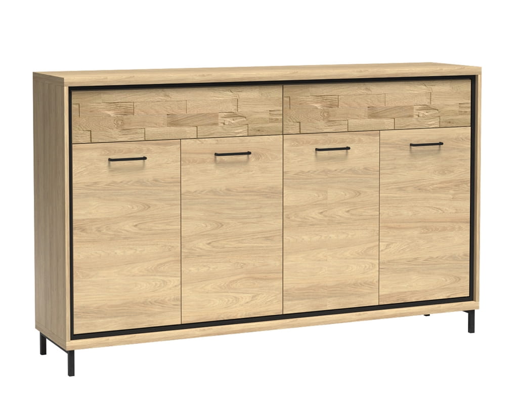 Duża komoda o szerokości aż 177 cm. Dolna część to dwie szafy z podwójnymi drzwiami. W każdej z nich znajduje się półka do przechowywania. Komoda posiada dwie szuflady, otwierane na dotyk, które wysuwają się na prowadnicach. Zawiasy, jakie zastosowano w drzwiach, to najwyżej jakości zawiasy z cichym domykiem, solidne, metalowe. Czarne uchwyty i ozdobna listwa dookoła mebla tworzy ciekawe połączenie z jasną płytą mebla. Kolor najbardziej zbliżony do naturalnego koloru drewna. Komoda pasuje do sypialni, salonu, czy pokoju młodzieżowego, jest uniwersalna i bardzo pojemna. Nowoczesny, industrialny styl. Wykorzystać ją możemy również jako szafa w jadalni do trzymania talerzy, pięknej wazy czy świątecznych dekoracji.