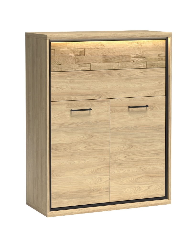 Mała, funkcjonalna komoda w jasnym kolorze hikora. Górna część składa się z dwóch szuflad. Wysuwają się na solidnych prowadnicach .Otwierają się na dotyk. W dolnej części znajdziemy szafę, za której frontami znajduje się półka. Czarne uchwyty dodają charakteru. W połączeniu z dodatkowymi nogami w tym samym kolorze stworzą niespotykaną aranżację. Pasuje do salonu, sypialni czy jadalni w stylu industrialnym. Jako dodatek możemy wykorzystać oświetlenie LED i dekoracyjną, dębową deskę na froncie. Po podświetleniu będzie ciekawym efektem w pokoju. Komoda ta jest dość wąska. W pokoju będziemy mogli dostawić obok niej inny mebel z kolekcji.