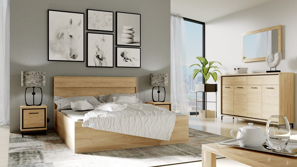 Ciepły kolor mebli idealnie zestawiony z surowymi, czarnymi elementami. Możliwość wyboru dodatkowych opcji.