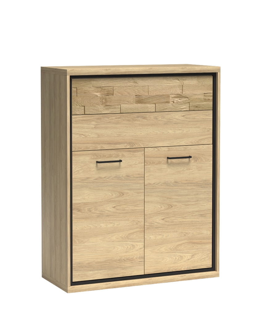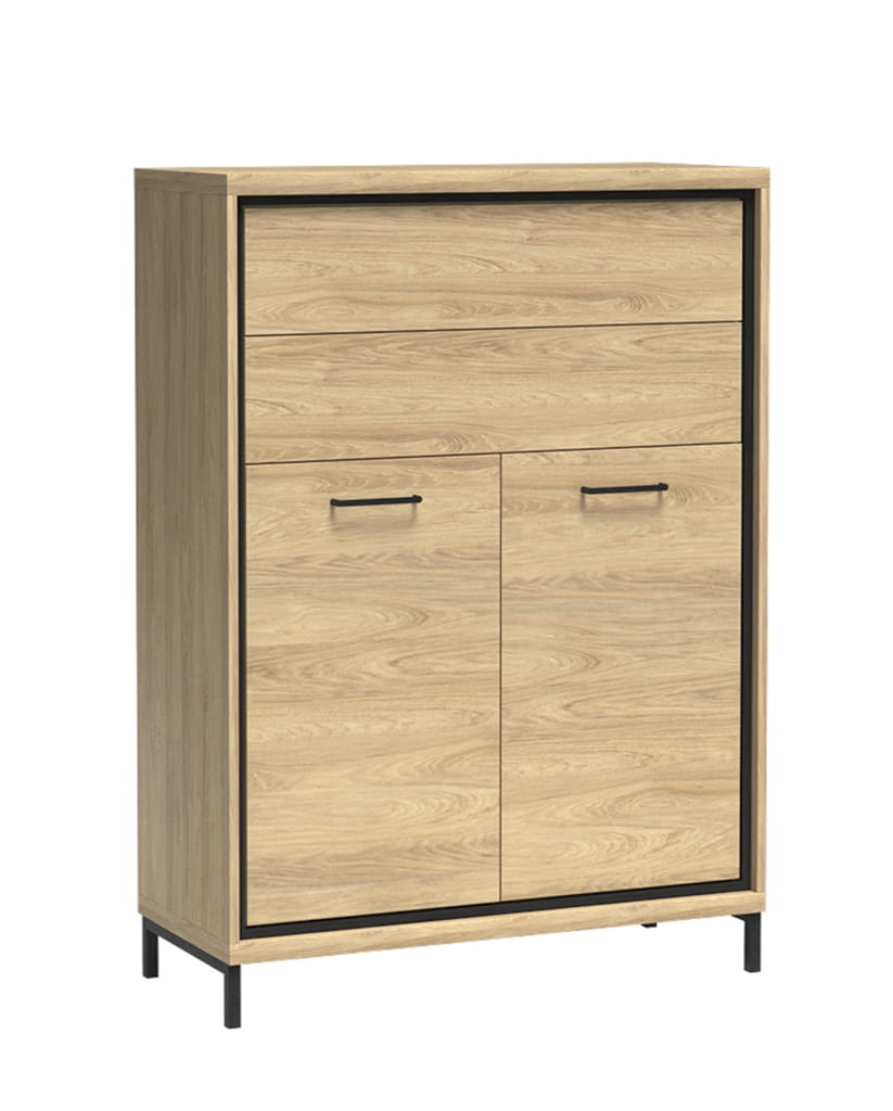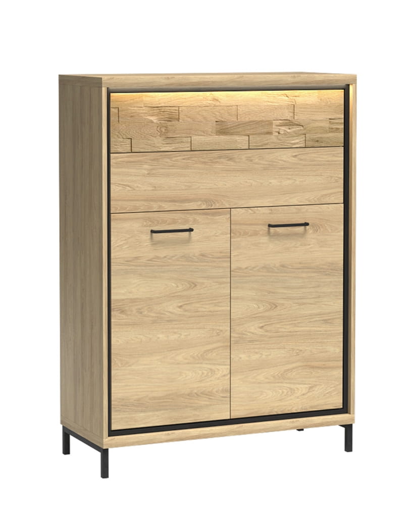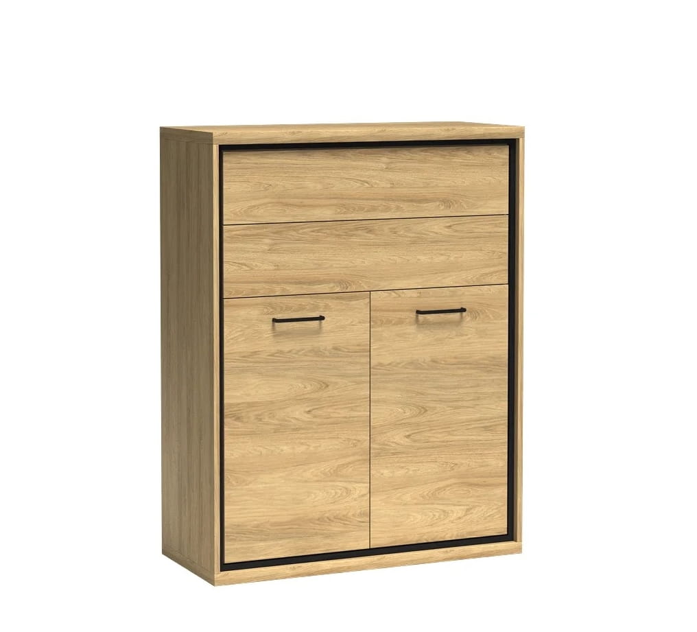 Mała, funkcjonalna komoda w jasnym kolorze hikora. Górna część składa się z dwóch szuflad. Wysuwają się na solidnych prowadnicach .Otwierają się na dotyk. W dolnej części znajdziemy szafę, za której frontami znajduje się półka. Czarne uchwyty dodają charakteru. W połączeniu z dodatkowymi nogami w tym samym kolorze stworzą niespotykaną aranżację. Pasuje do salonu, sypialni czy jadalni w stylu industrialnym. Jako dodatek możemy wykorzystać oświetlenie LED i dekoracyjną, dębową deskę na froncie. Po podświetleniu będzie ciekawym efektem w pokoju. Komoda ta jest dość wąska. W pokoju będziemy mogli dostawić obok niej inny mebel z kolekcji.