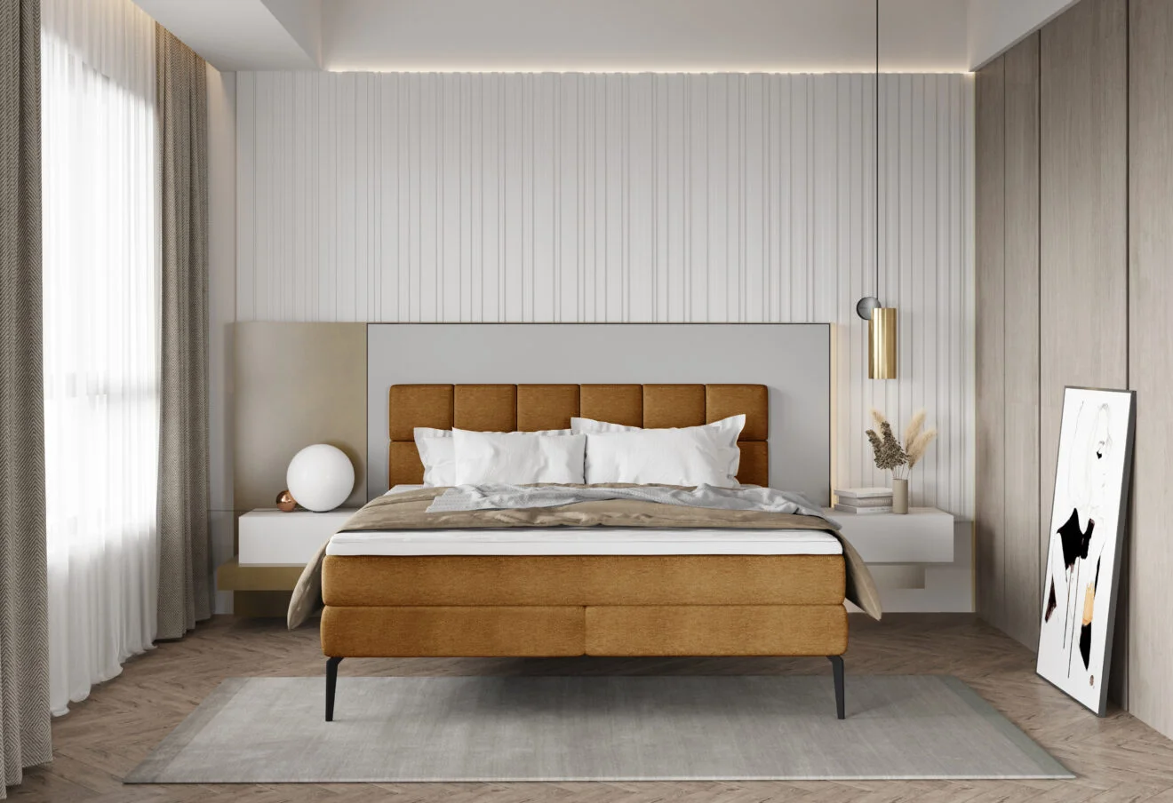 Adel to łóżko wyróżniające się prostym ale ciekawym zagłówkiem. Pionowe i poziome przeszycia układają się w szachownicę, która przykuwa uwagę. Wykorzystany w konstrukcji bonellowy materac zapewnia komfortowy sen, a wysokie, czarne nóżki dodają lekkości konstrukcji.