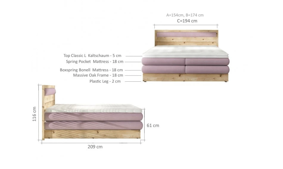 Łóżko kontynentalne na drewnianej dębowej ramie DIORI z seri Box Springs Massiv Wood