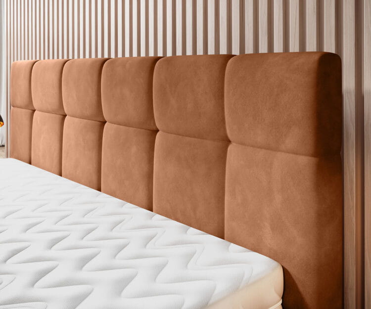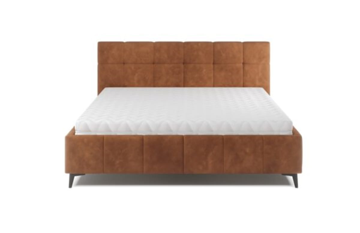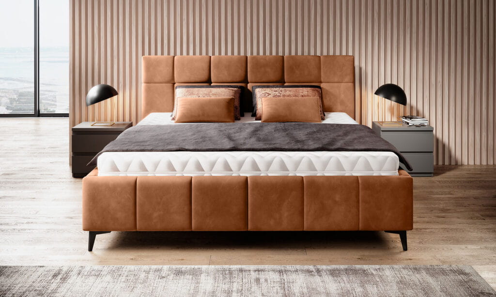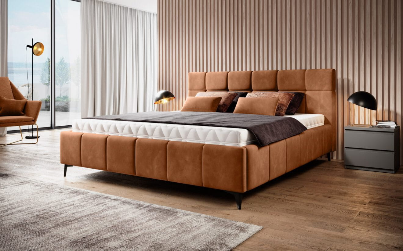 Model ten wyróżnia nowoczesne wezgłowie oraz rama łóżka z ozdobnymi przeszyciami. Wysokie, metalowe nogi dodają lekkości konstrukcji. Łóżko dostępne jest w dwóch wariantach – wyposażone w system manualnej regulacji wysokości, który pozwala dostosować materac do indywidualnych potrzeb użytkownika oraz w wersji z pojemnikiem, umożliwiając przechowywanie pościeli.