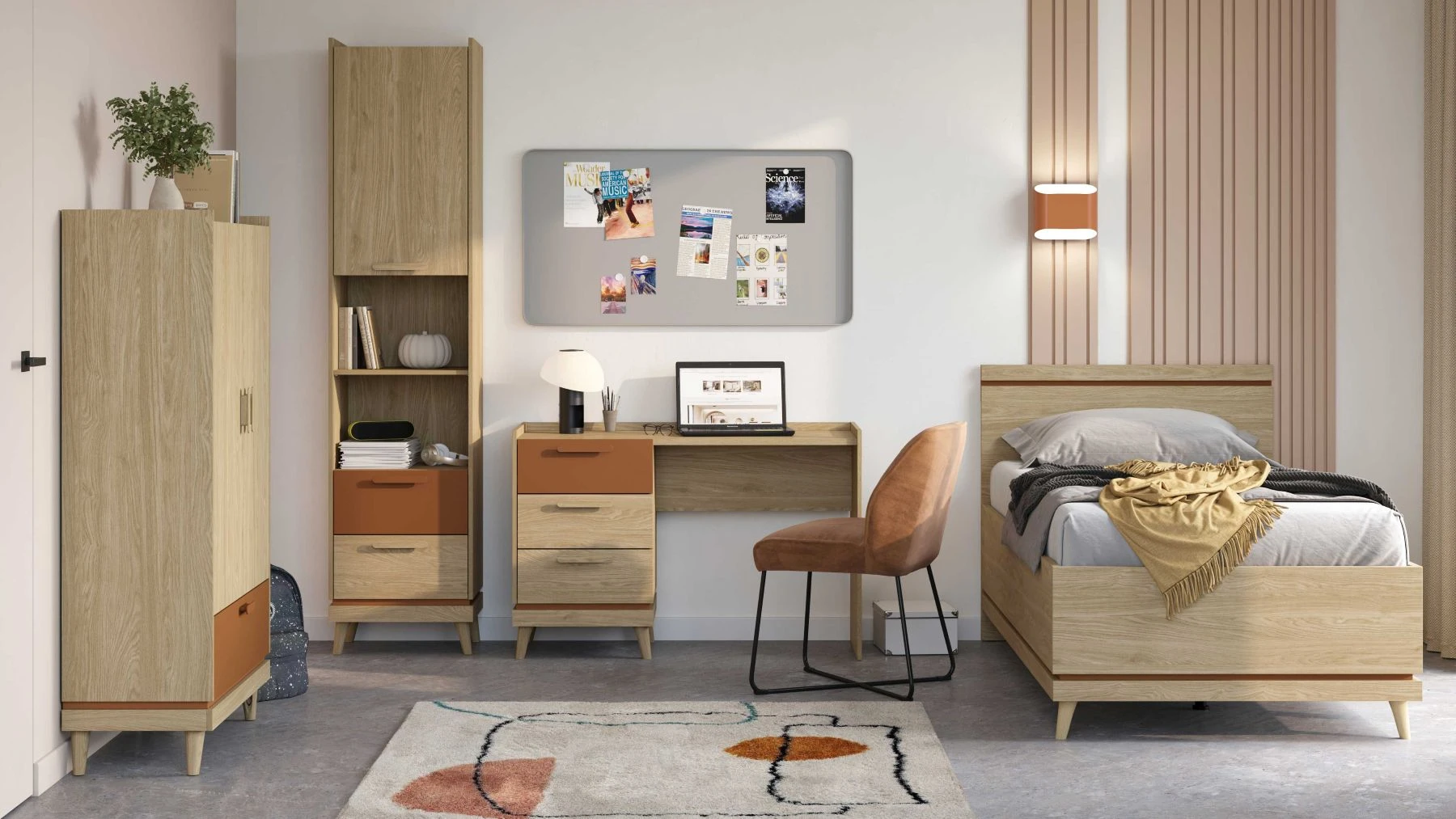 Kolekcja SCANDI to harmonijne połączenie skandynawskiej prostoty, funkcjonalności i nowoczesnego designu, stworzone z myślą zarówno o sypialni, jak i pokoju młodzieżowym. Charakterystyczne wysokie nóżki nadają meblom lekkości i ułatwiają utrzymanie porządku, a naturalne wykończenia wprowadzają do wnętrza przytulną, spokojną atmosferę. Kolekcja dostępna jest w modnych połączeniach kolorystycznych: zgaszona zieleń z dębem olejowanym oraz dąb olejowany z kolorem ceglanym, dzięki czemu łatwo dopasować ją do różnych aranżacji.