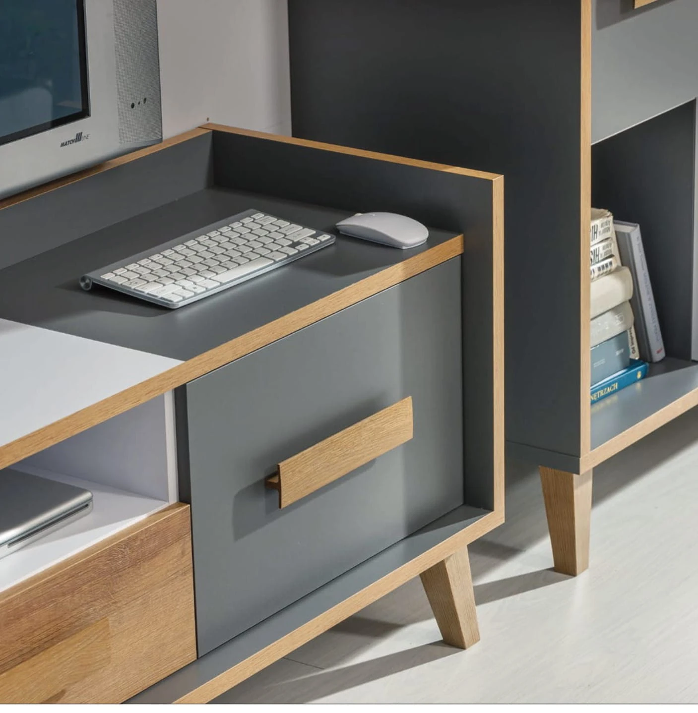 Modna kolorystyka i uniwersalność brył pozwalają na wiele możliwości zastosowania tej kolekcji mebli. Salon, pokój dzienny, pokój dziecka jak i również pokój młodzieżowy.