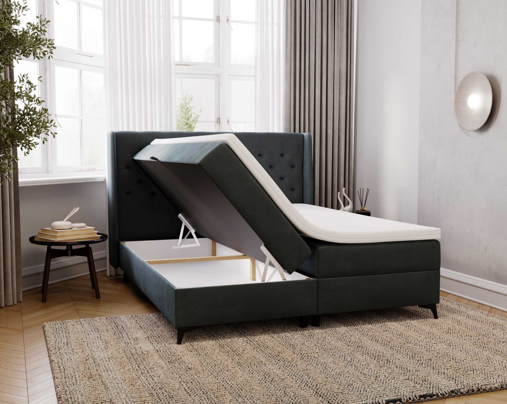 Dzięki zastosowaniu automatycznego sprężynowego mechanizmu, otwieranie pojemników na pościel staje się przyjemne i bezproblemowe, co dodatkowo ułatwia korzystanie z funkcjonalności łóżka.