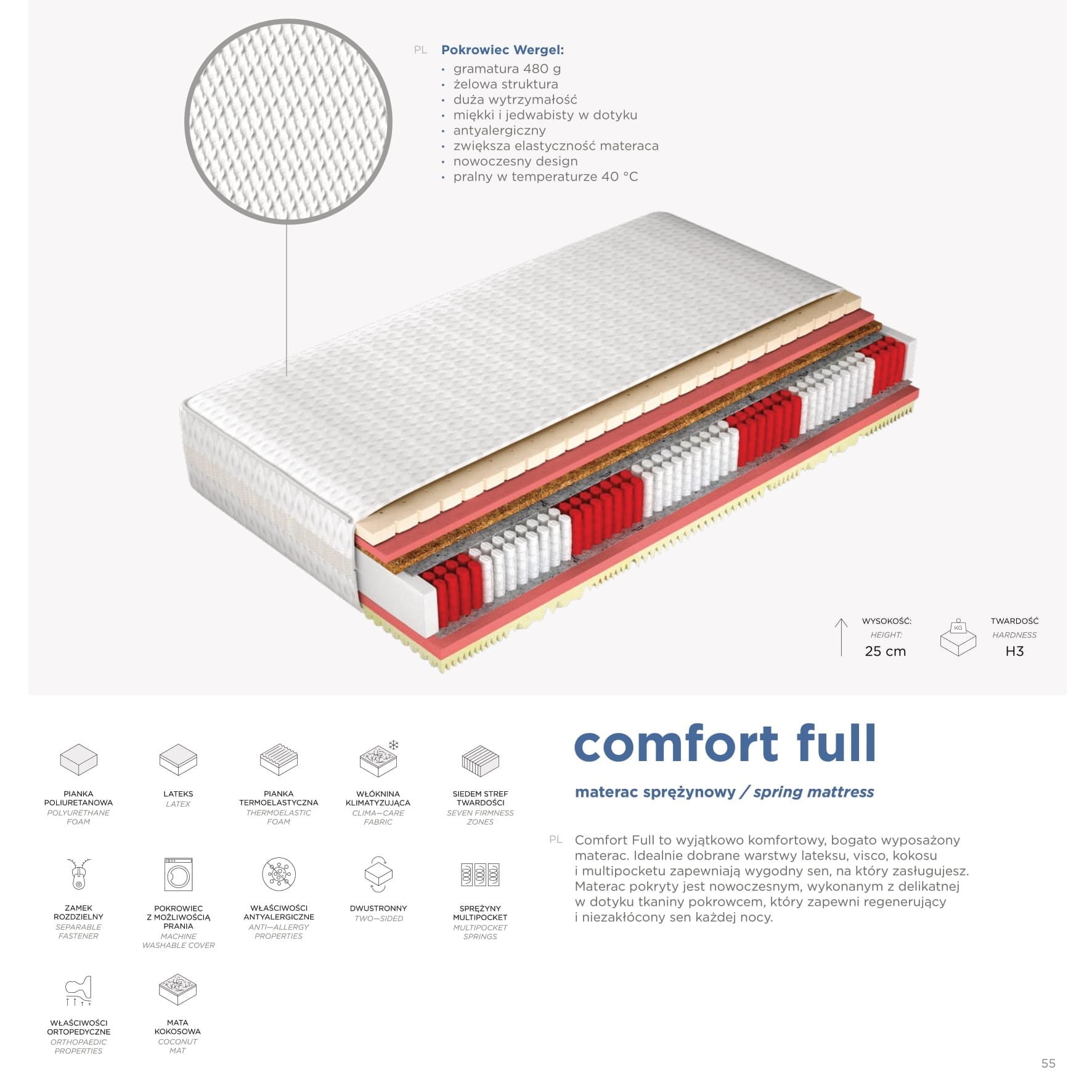 Comfort Full to wyjątkowo komfortowy, bogato wyposażony materac. Idealnie dobrane warstwy lateksu, visco, kokosu i multipocketu zapewniają wygodny sen, na który zasługujesz. Materac pokryty jest nowoczesnym, wykonanym z delikatnej w dotyku tkaniny pokrowcem, który zapewni regenerujący i niezakłócony sen każdej nocy.