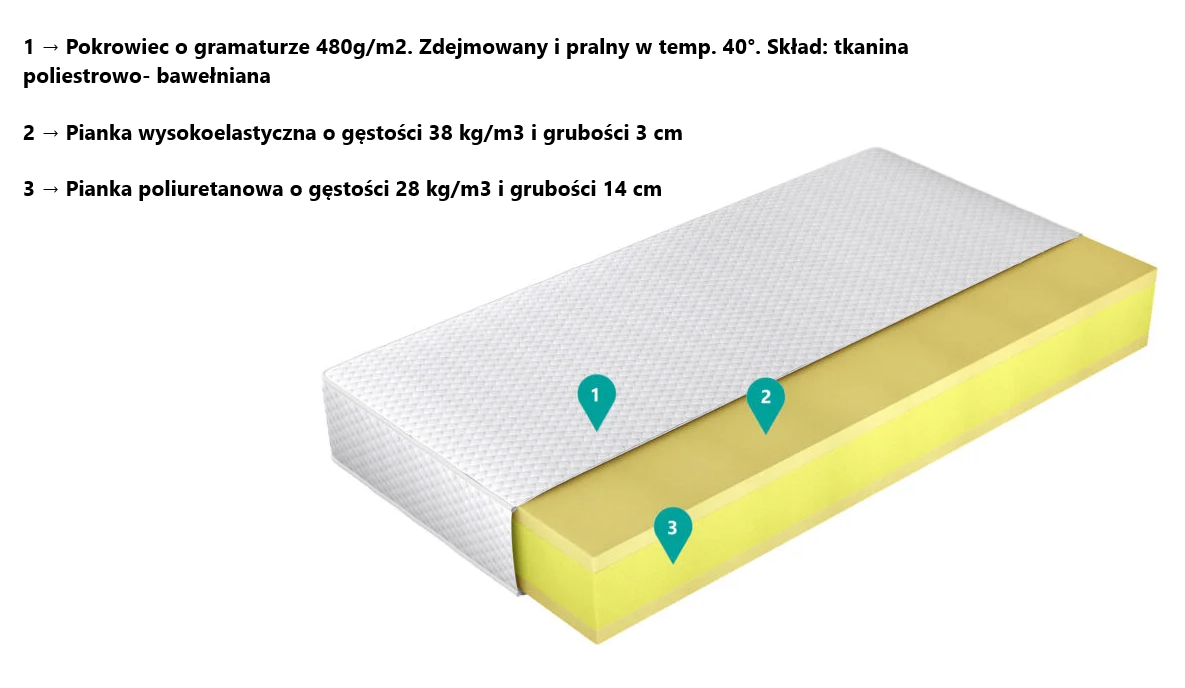Materac Comfort Massage posiada w swojej strukturze dwa rodzaje pianki- poliuretanową, która jest elastyczna, ale na tyle twarda, aby dopasować się do kształtu naszego ciała i stworzyć wygodne warunki do spania, oraz pianki wysokoelastycznej, tzw. pianki HR, która odzyskuje swój pierwotny kształt nawet dwa razy szybciej niż pianka poliuretanowa.