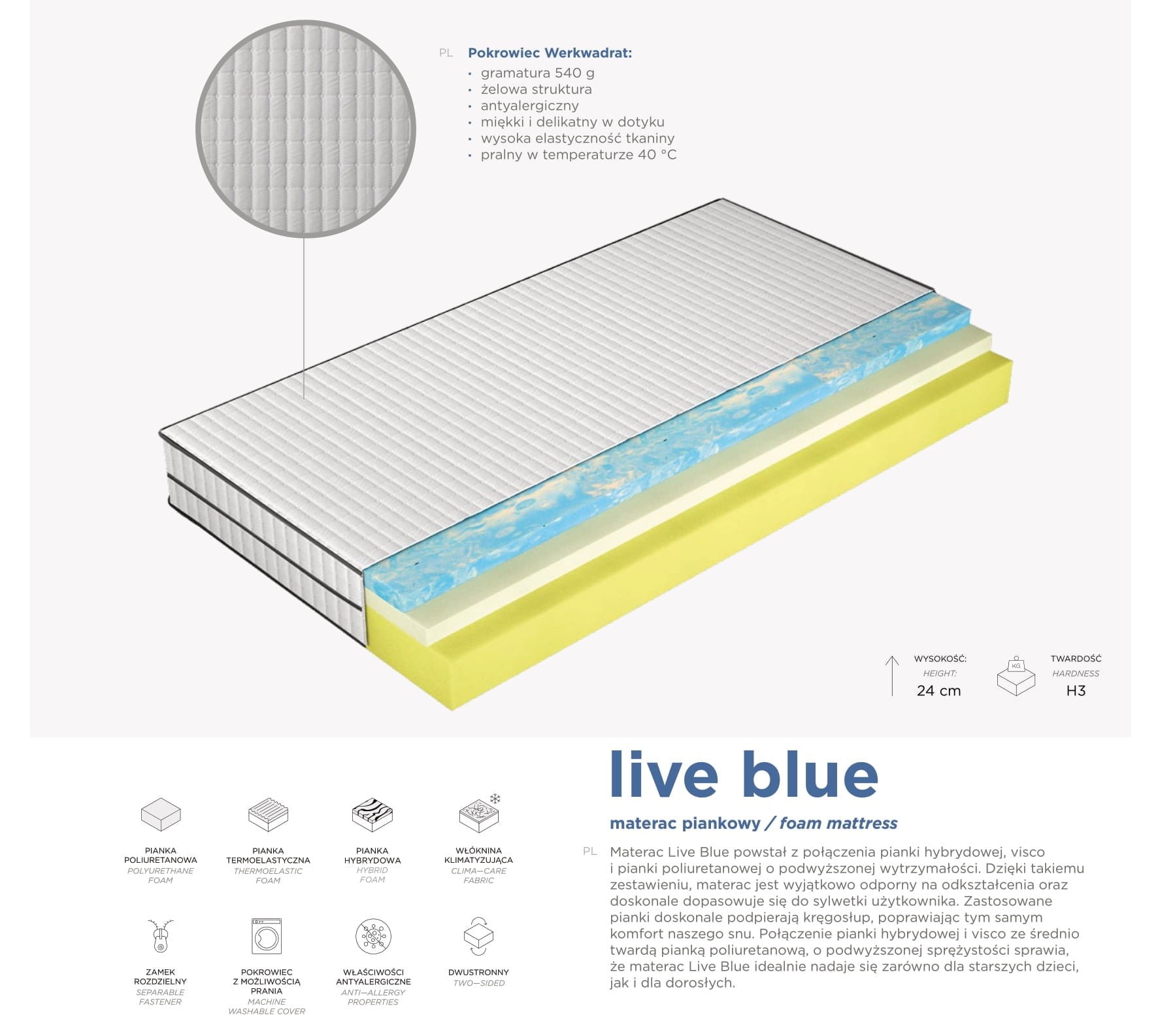Materac Live Blue powstał z połączenia pianki hybrydowej, visco i pianki poliuretanowej o podwyższonej wytrzymałości. Dzięki takiemu zestawieniu, materac jest wyjątkowo odporny na odkształcenia oraz doskonale dopasowuje się do sylwetki użytkownika.
