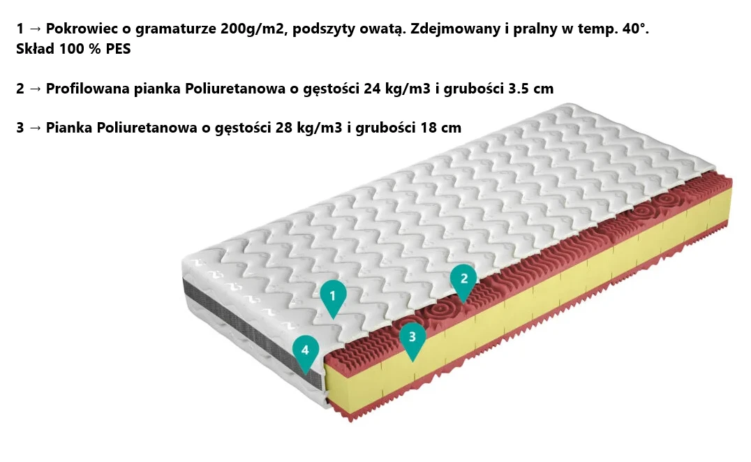 Materac jest bardzo wytrzymały, nie odkształca się i szybko wraca do swojej pierwotnej formy. Pianka profilowana zapewni nam komfort przy dłuższym odpoczynku i zapewni nam wyjątkowo przyjemne odczucia.