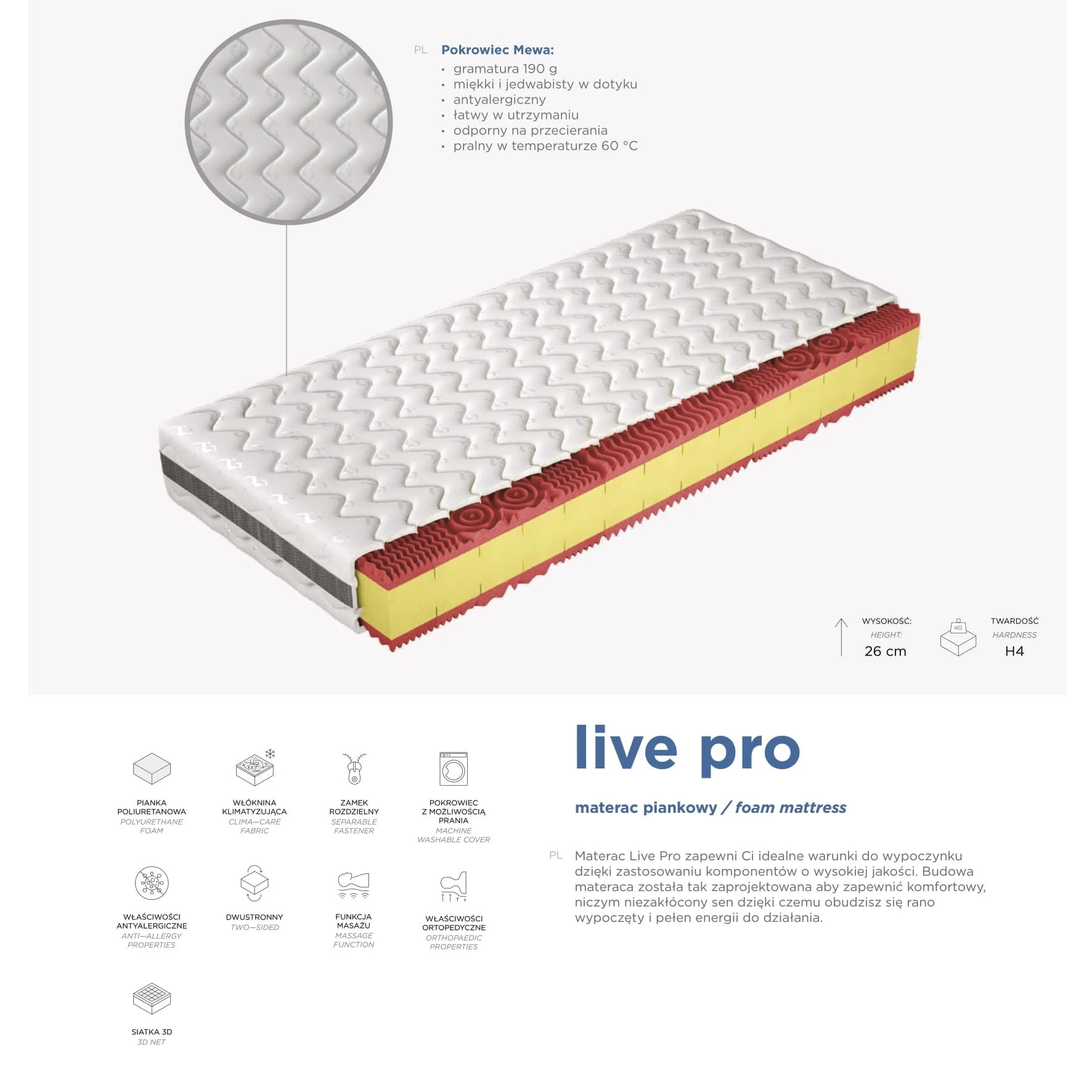 Materac Live Pro zapewni Ci idealne warunki do wypoczynku dzięki zastosowaniu komponentów o wysokiej jakości.