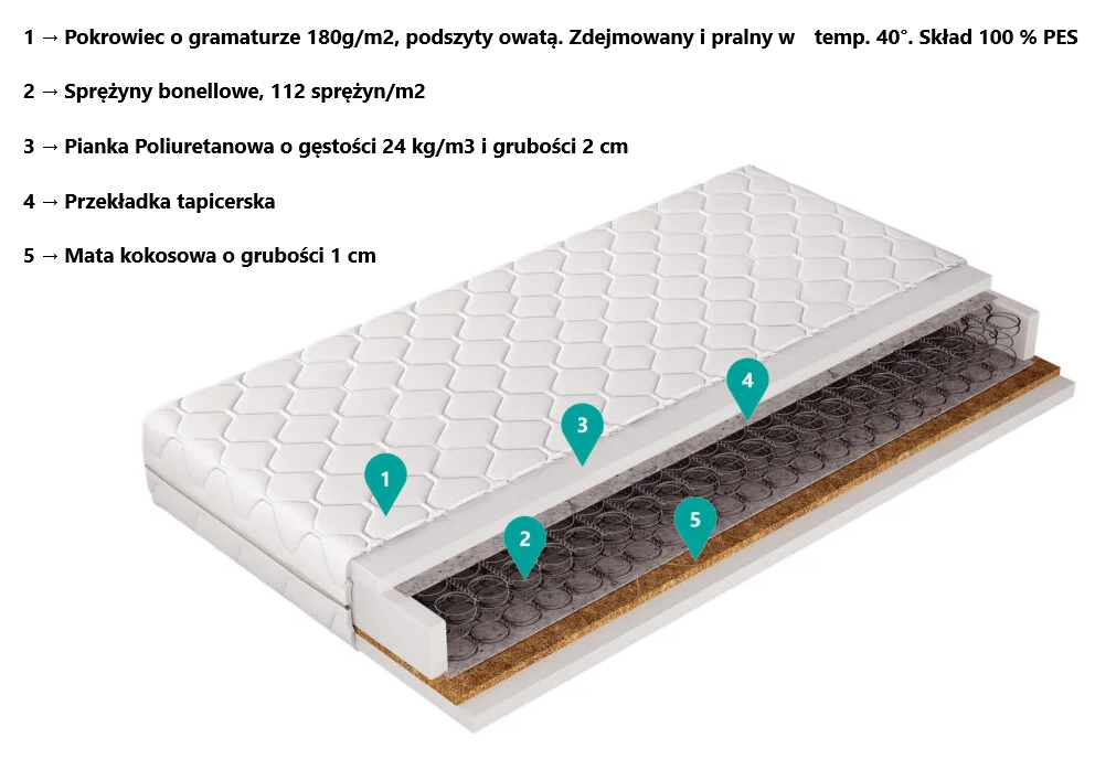 Standard Kokos to materac bonellowy, który dodatkowo wyposażony został w matę kokosową igłowaną.