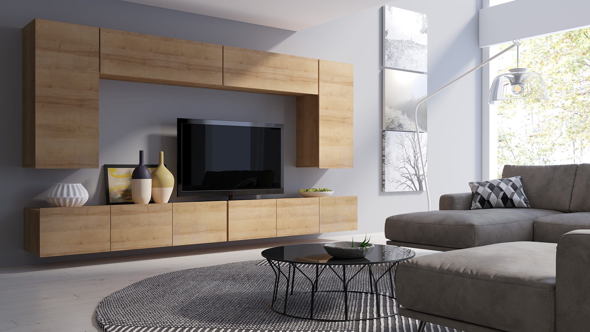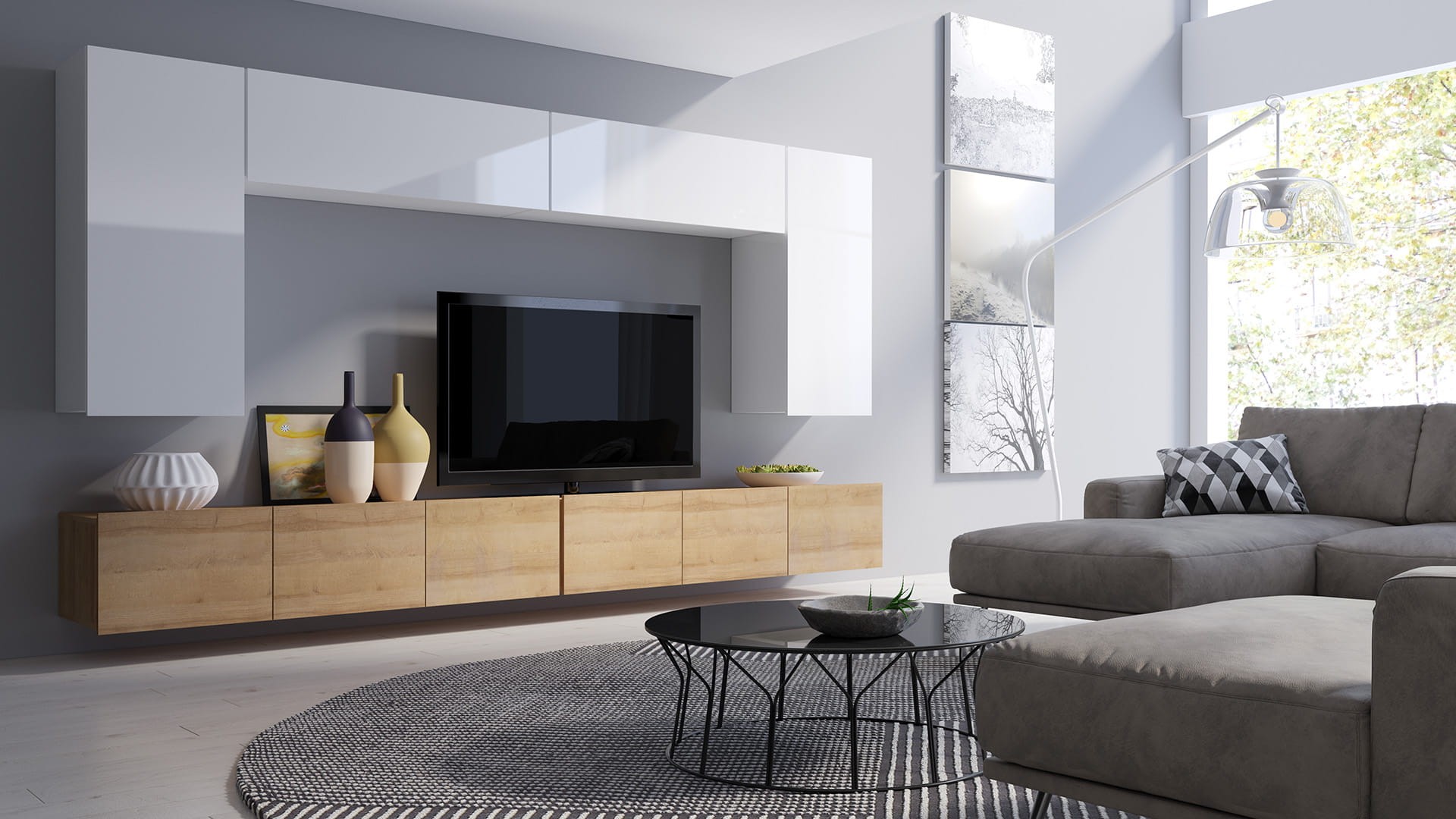 Cechą charakterystyczną prezentowanej kolekcji jest brak uchwytów w szafkach, a także możliwość swobodnego ustawienia meblościanki w zależności od indywidualnych preferencji i potrzeb.