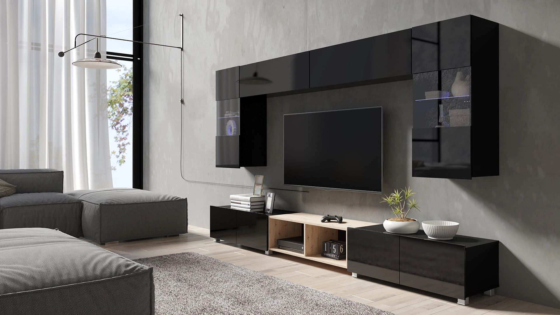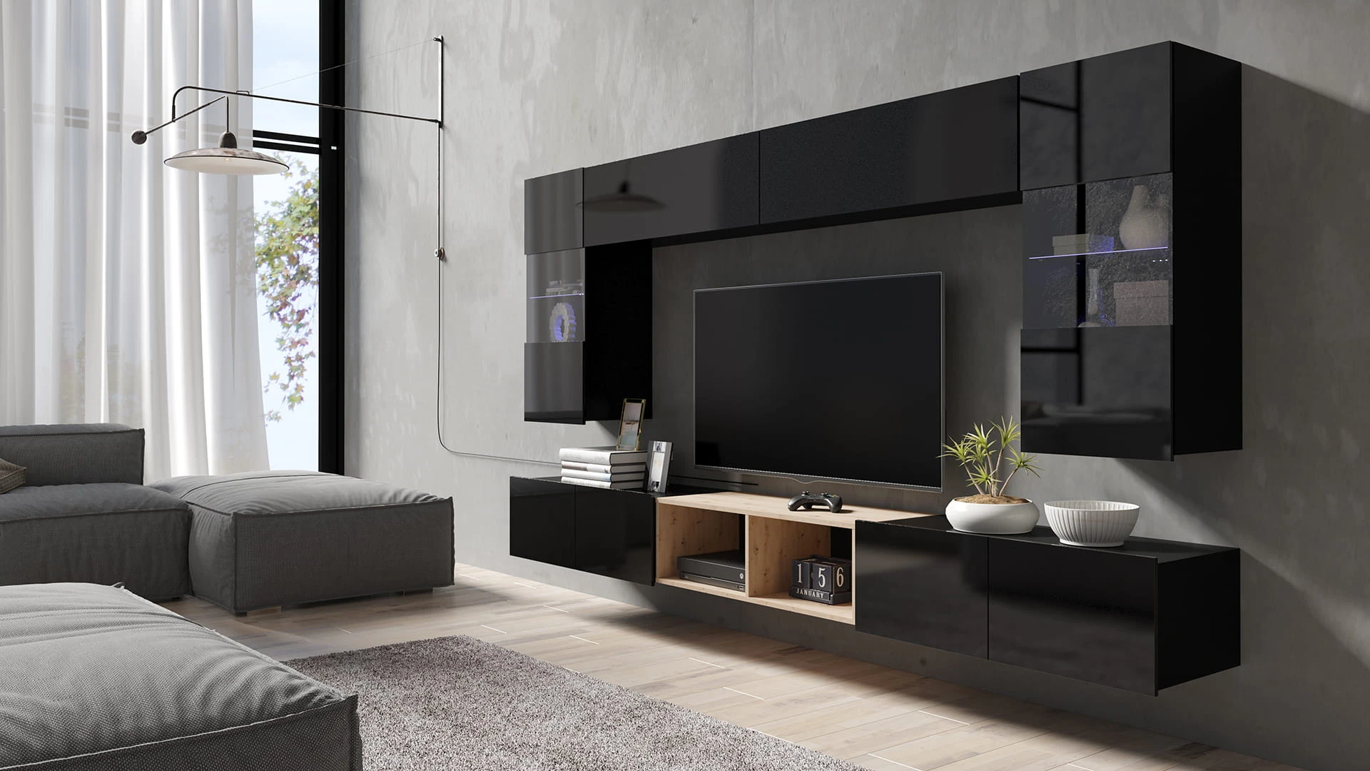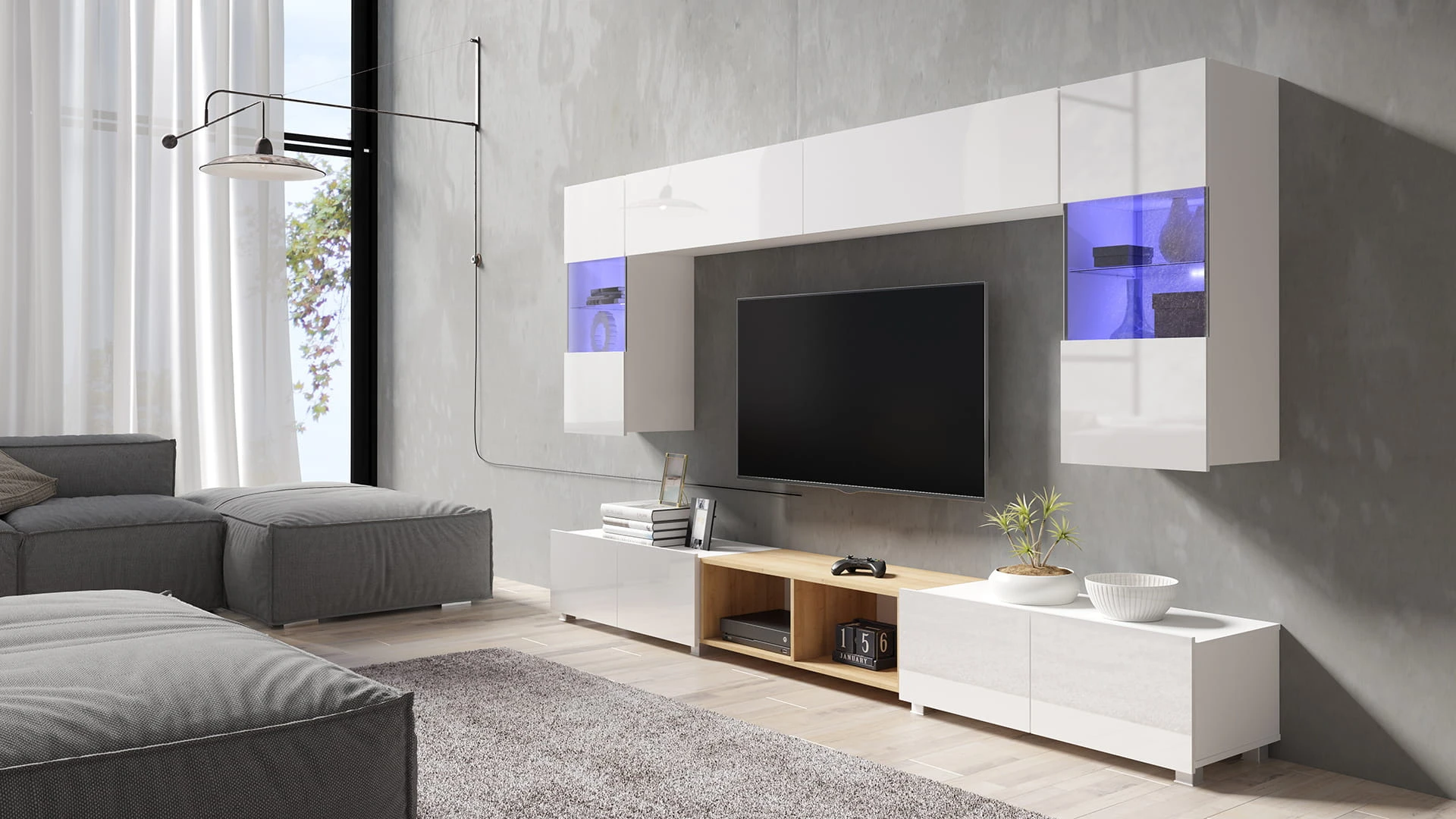 Cechą charakterystyczną prezentowanej kolekcji jest brak uchwytów w szafkach, a także możliwość swobodnego ustawienia meblościanki w zależności od indywidualnych preferencji i potrzeb.
