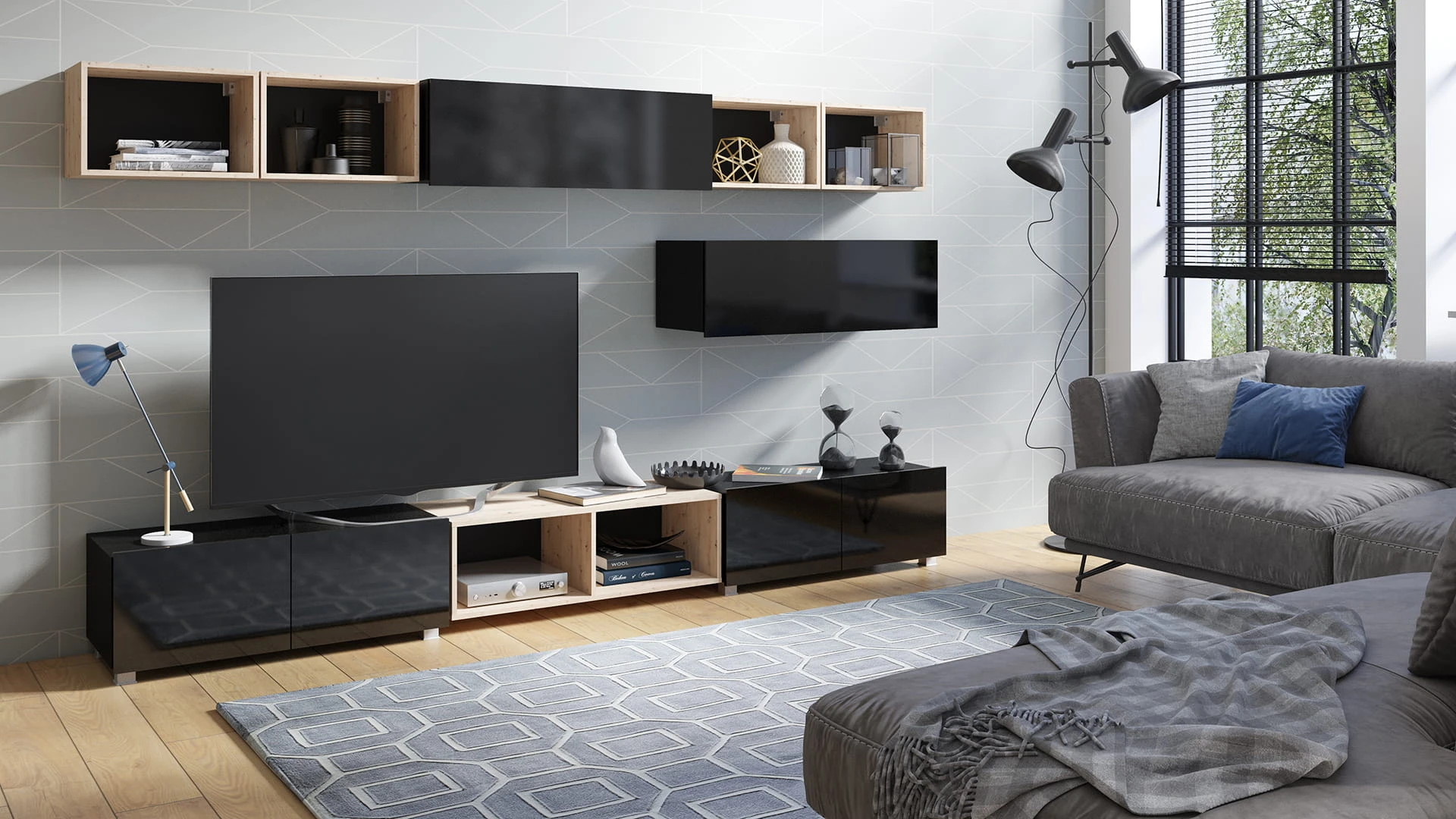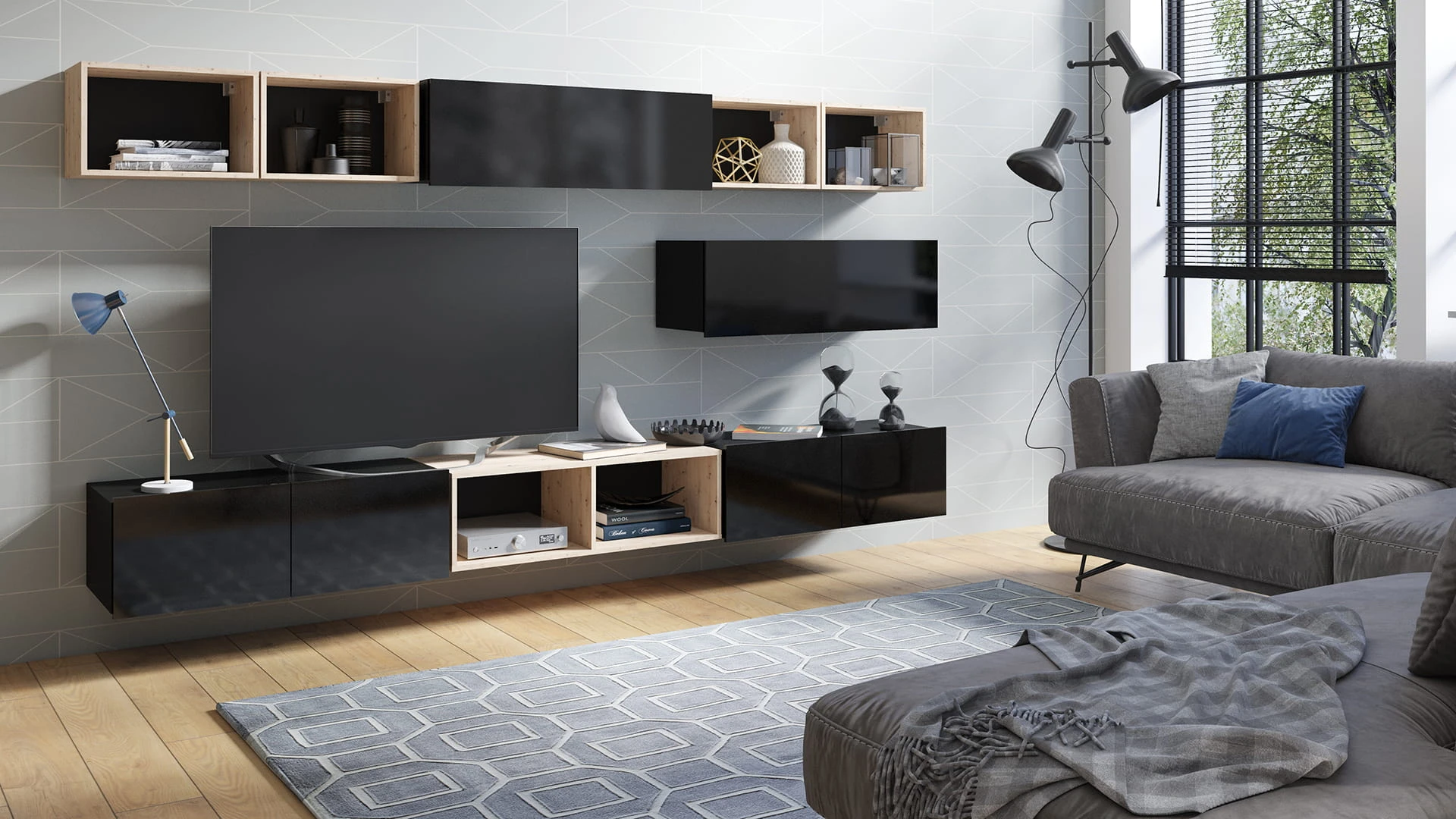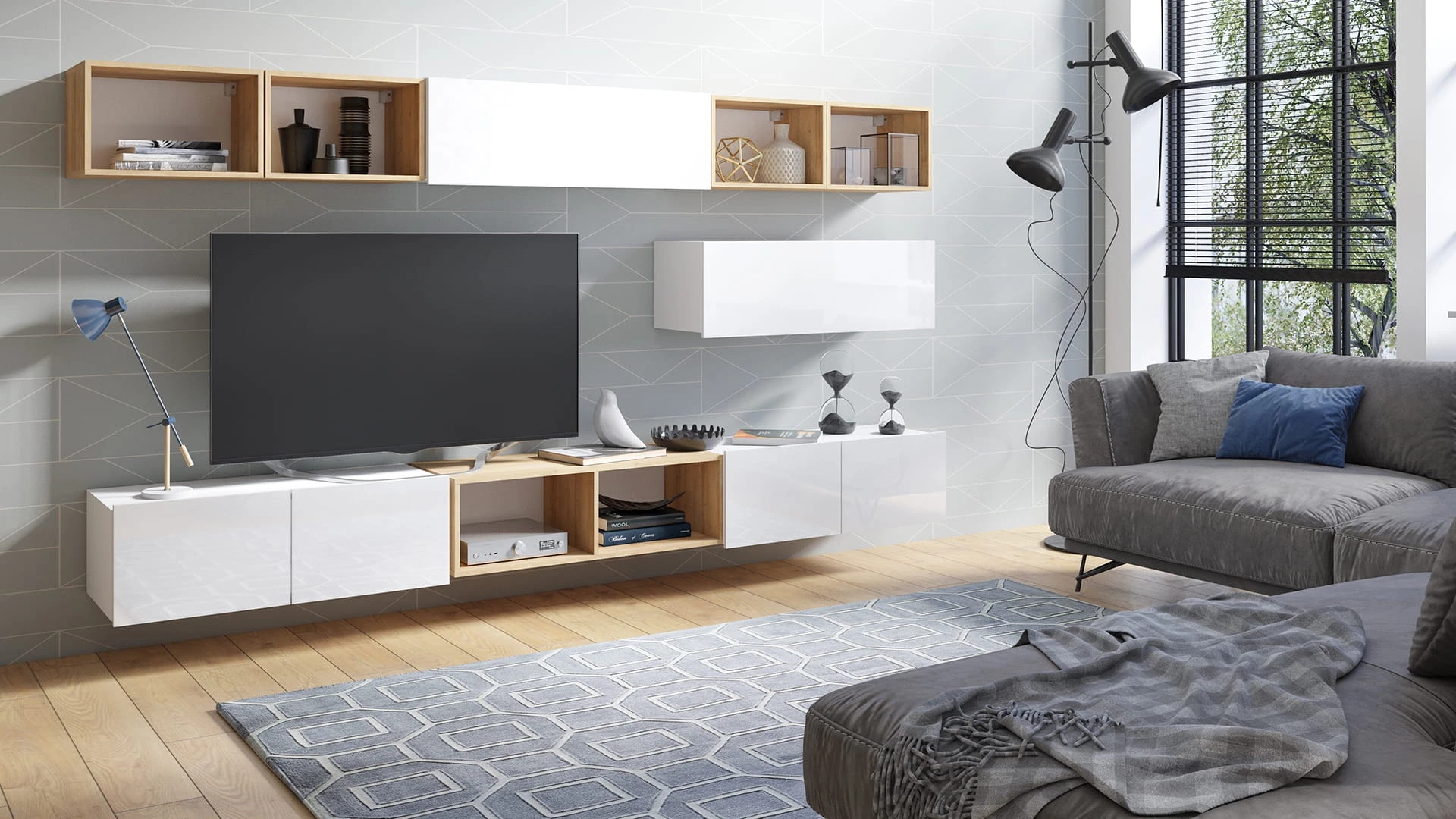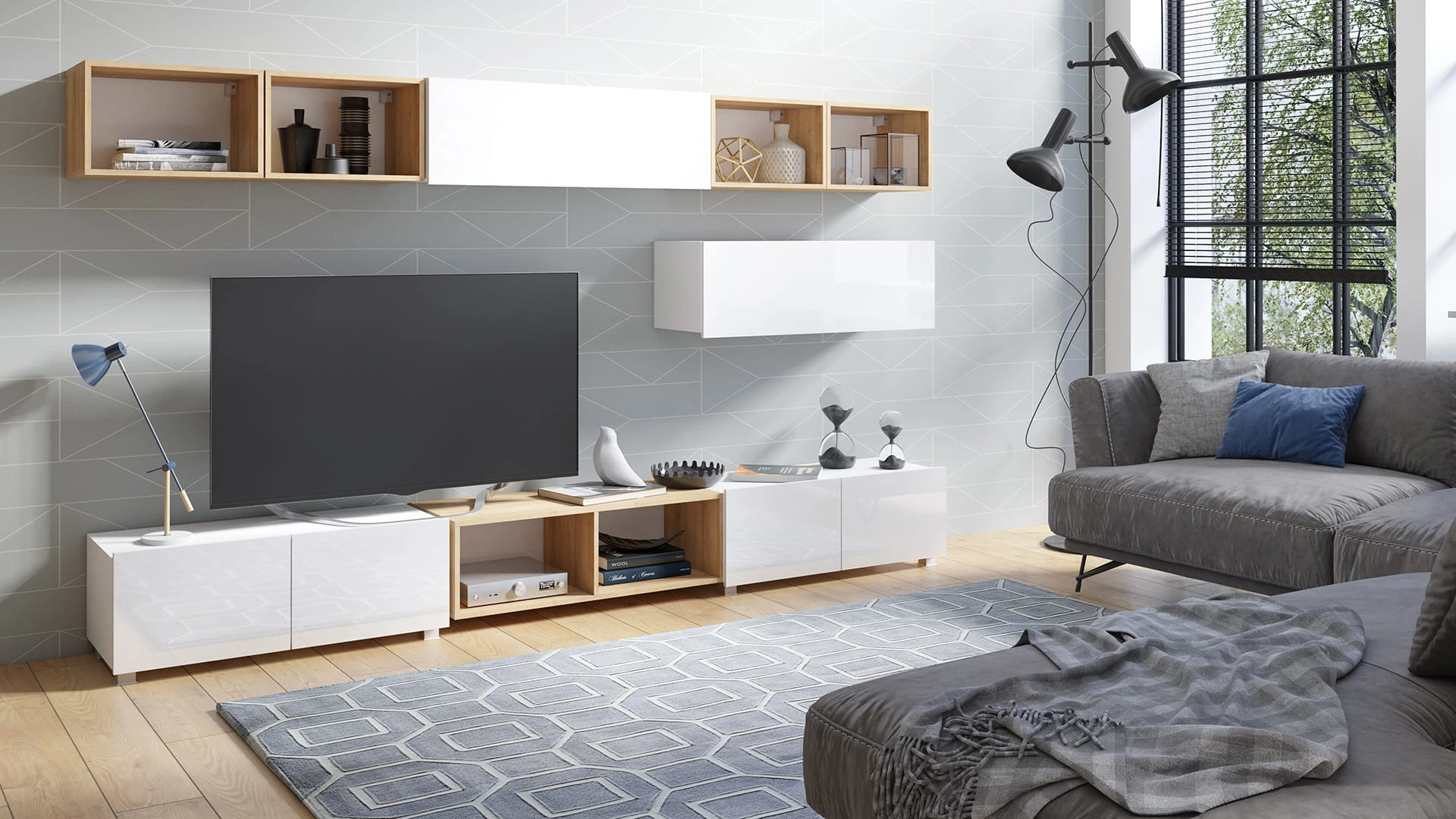 Cechą charakterystyczną prezentowanej kolekcji jest brak uchwytów w szafkach, a także możliwość swobodnego ustawienia meblościanki w zależności od indywidualnych preferencji i potrzeb.