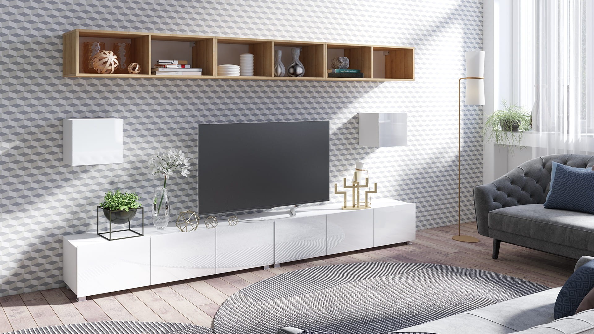 Cechą charakterystyczną prezentowanej kolekcji jest brak uchwytów w szafkach, a także możliwość swobodnego ustawienia meblościanki w zależności od indywidualnych preferencji i potrzeb.
