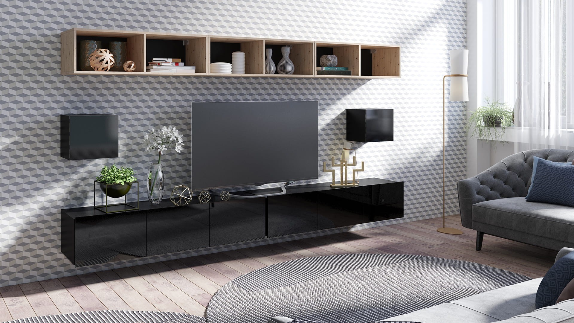 Meblościanka PRESTIŻ 34 Biała Czarna Szafka RTV 300 cm Połysk Do Salonu Nowoczesna