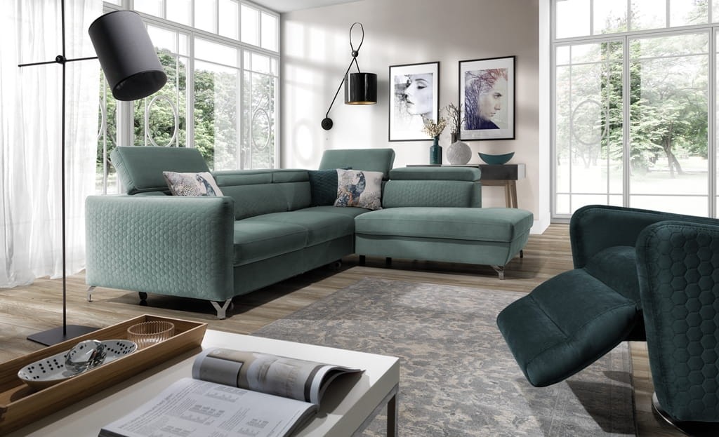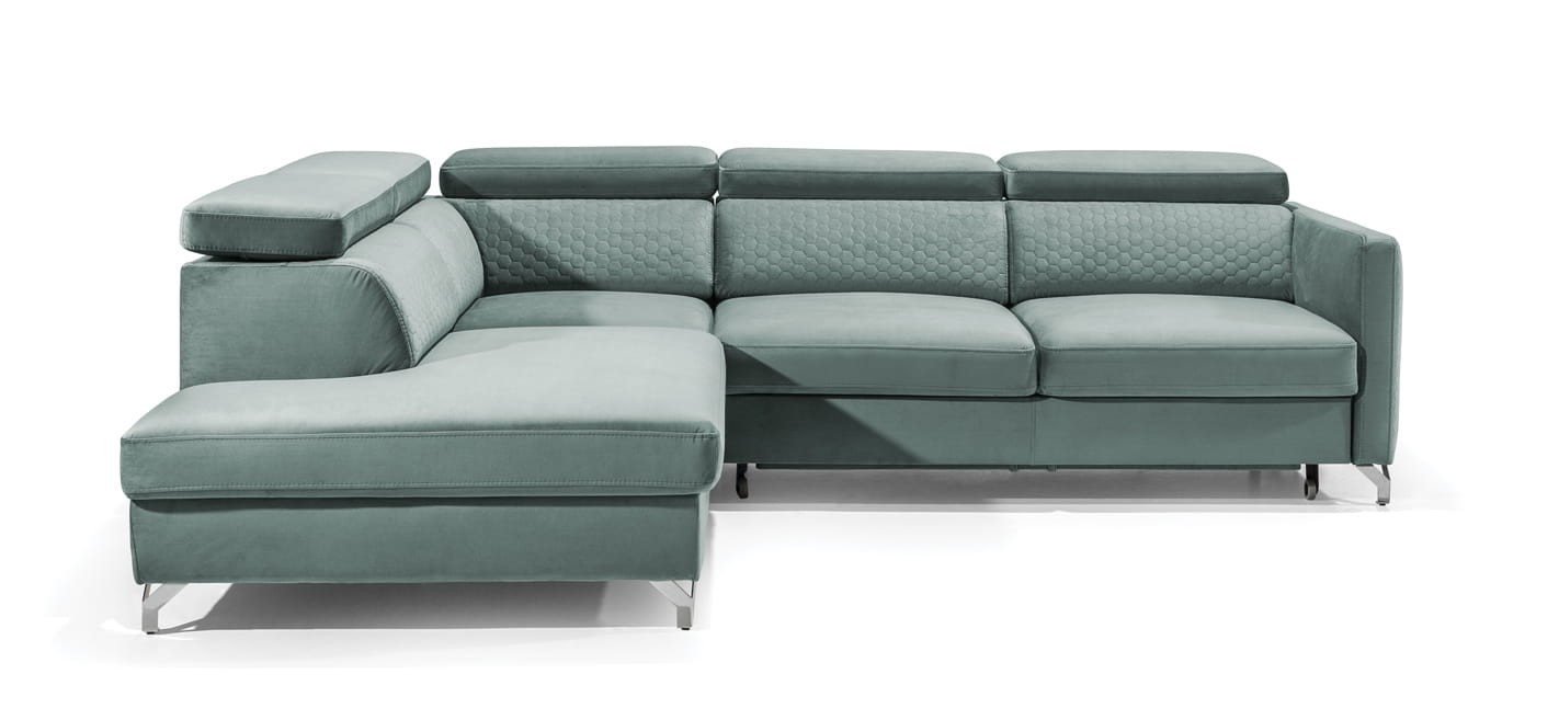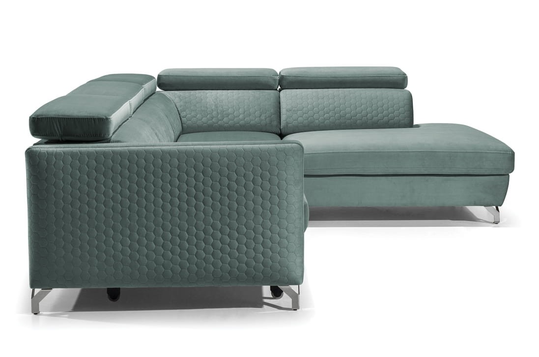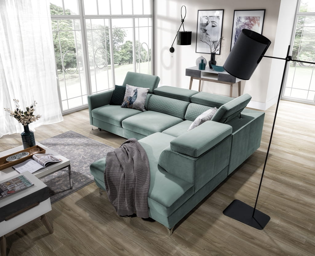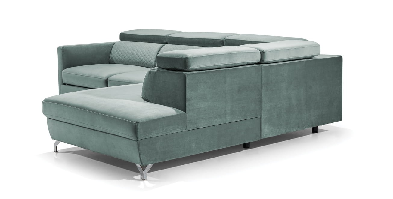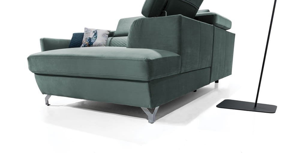Narożnik Marozzo o szerokości 265 cm przyciąga wzrok dekoracyjnymi przeszyciami na bokach, które nadają mu unikalnego charakteru. Konstrukcja wsparta na wysokich, designerskich nóżkach sprawia, że mebel wygląda niezwykle lekko i nowocześnie, ułatwiając jednocześnie utrzymanie czystości podłogi pod spodem.