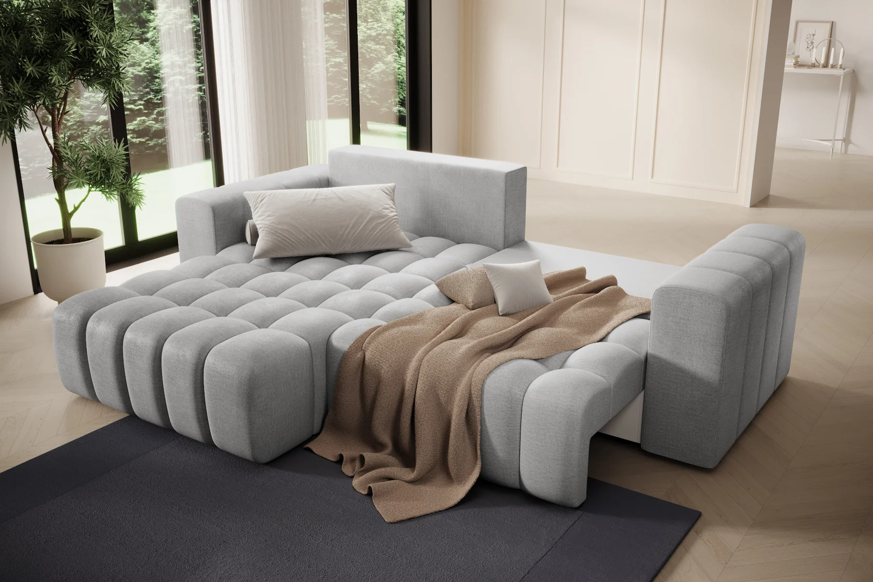 BONETT to nie tylko designerski mebel, ale też funkcjonalny narożnik z funkcją spania. Dzięki systemowi DL, w kilka chwil zamienisz go w wygodne łóżko z równą powierzchnią do spania. To doskonałe rozwiązanie zarówno na co dzień, jak i na okazjonalne nocowanie gości. W codziennym użytkowaniu nieoceniony jest również pojemnik na pościel, który umożliwia łatwe przechowywanie kołder, poduszek czy sezonowych tekstyliów. Dzięki temu Twój salon zawsze wygląda estetycznie i schludnie, a potrzebne rzeczy masz pod ręką.