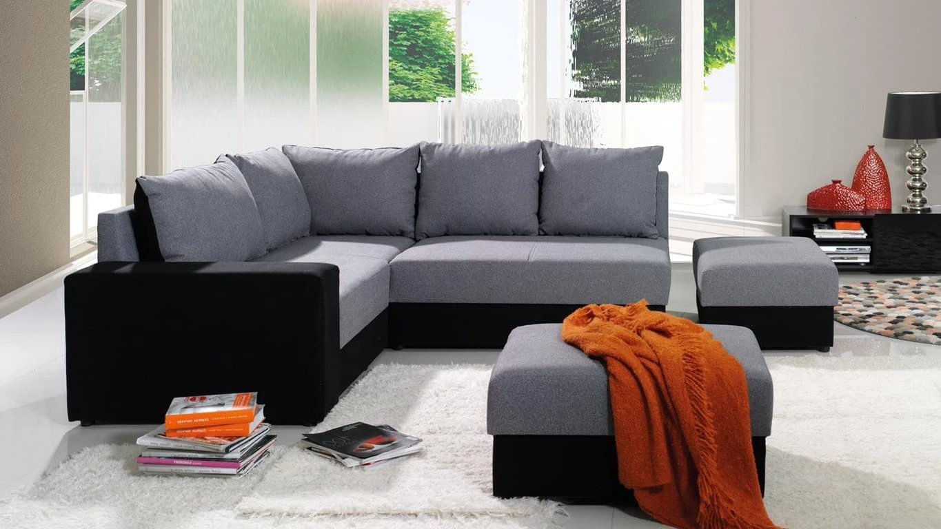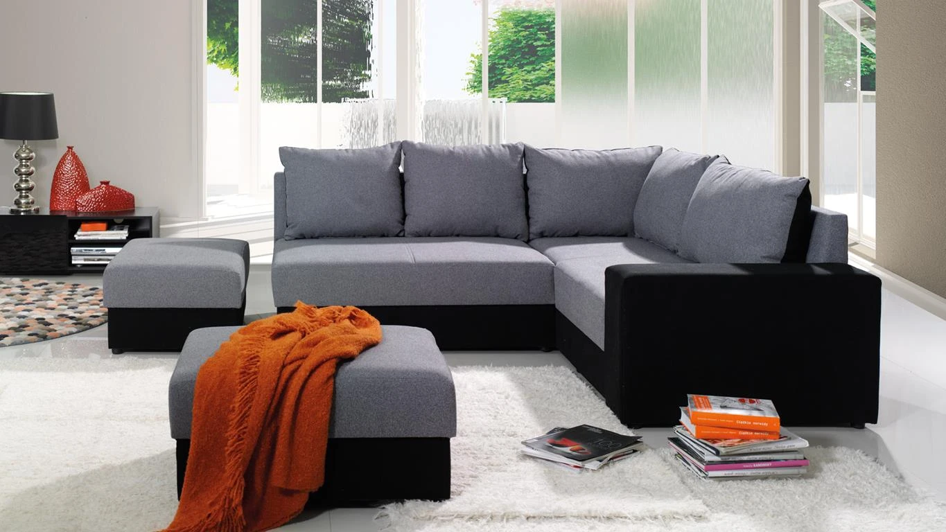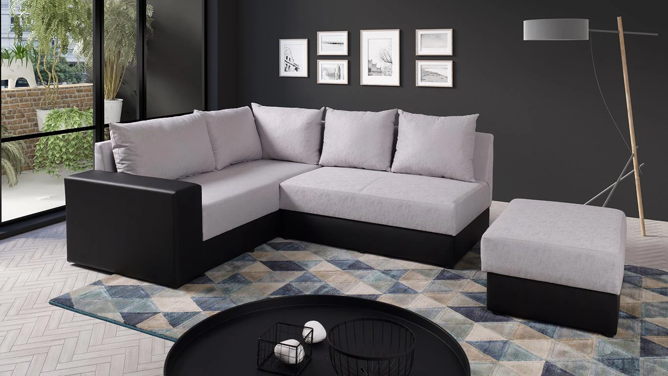 Zestawienie ze sobą dwóch kolorów tkaniny, obszerne poduszki na oparciu sprawiają, że narożnik prezentuje się oryginalnie i elegancko.