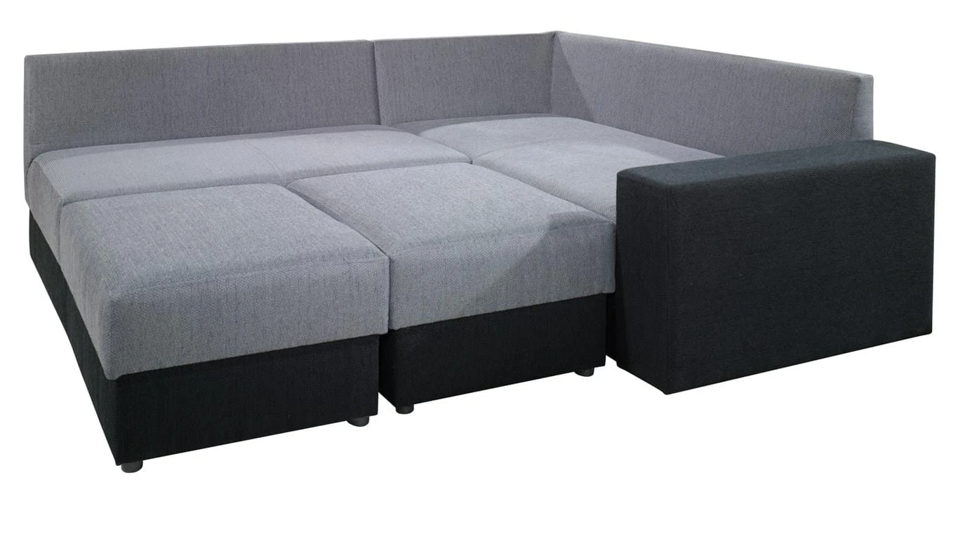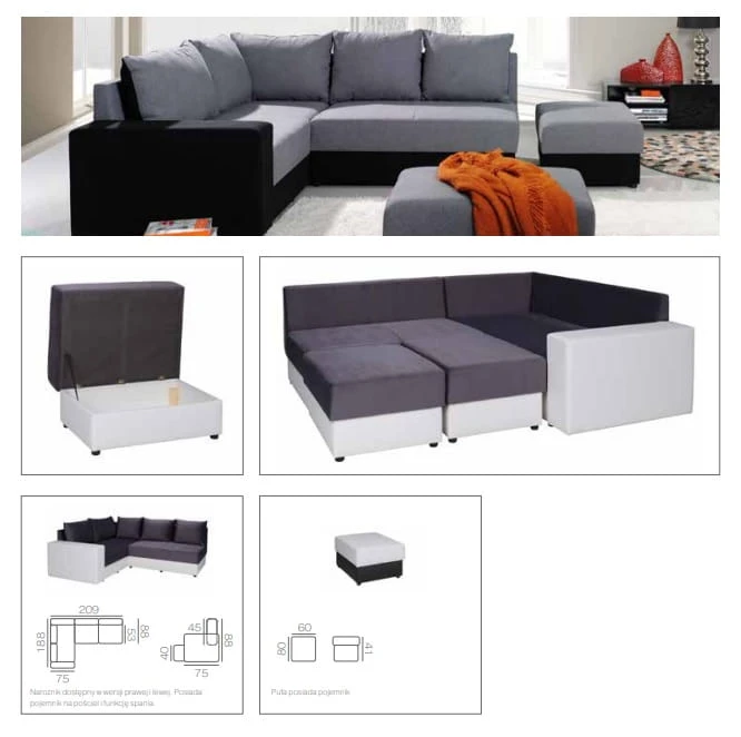 Narożnik bez pojemnika na pościel i możliwości rozłożenia. Funkcję spania można uzyskać po dostawieniu puf Bono, dostępnych w ofercie sklepu.