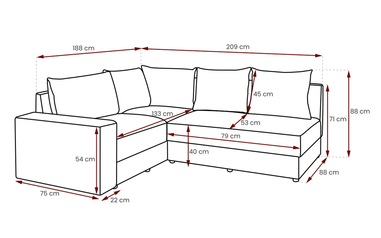 Wymiary narożnika 209 x 188 cm to duża przestrzeń do codziennego wypoczynku z możliwością wkomponowania mebla w przestronnym jak i w mniejszym salonie.