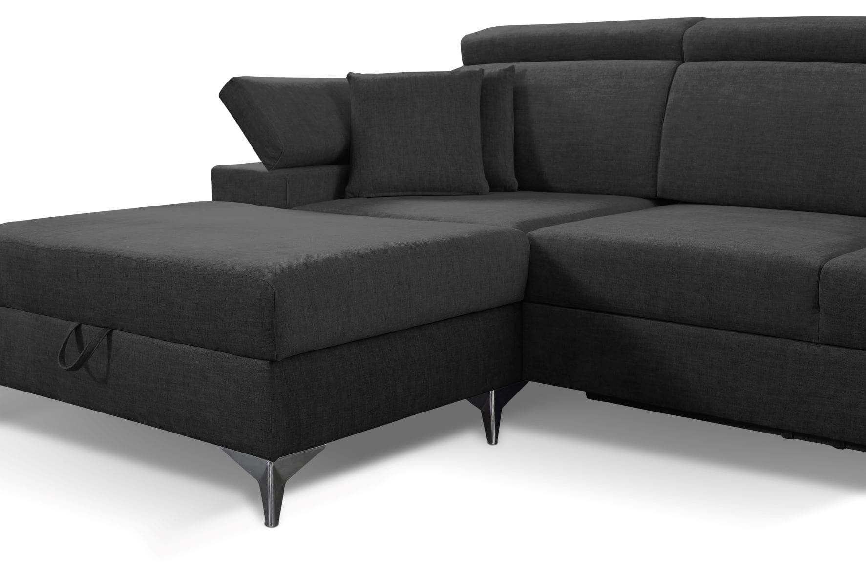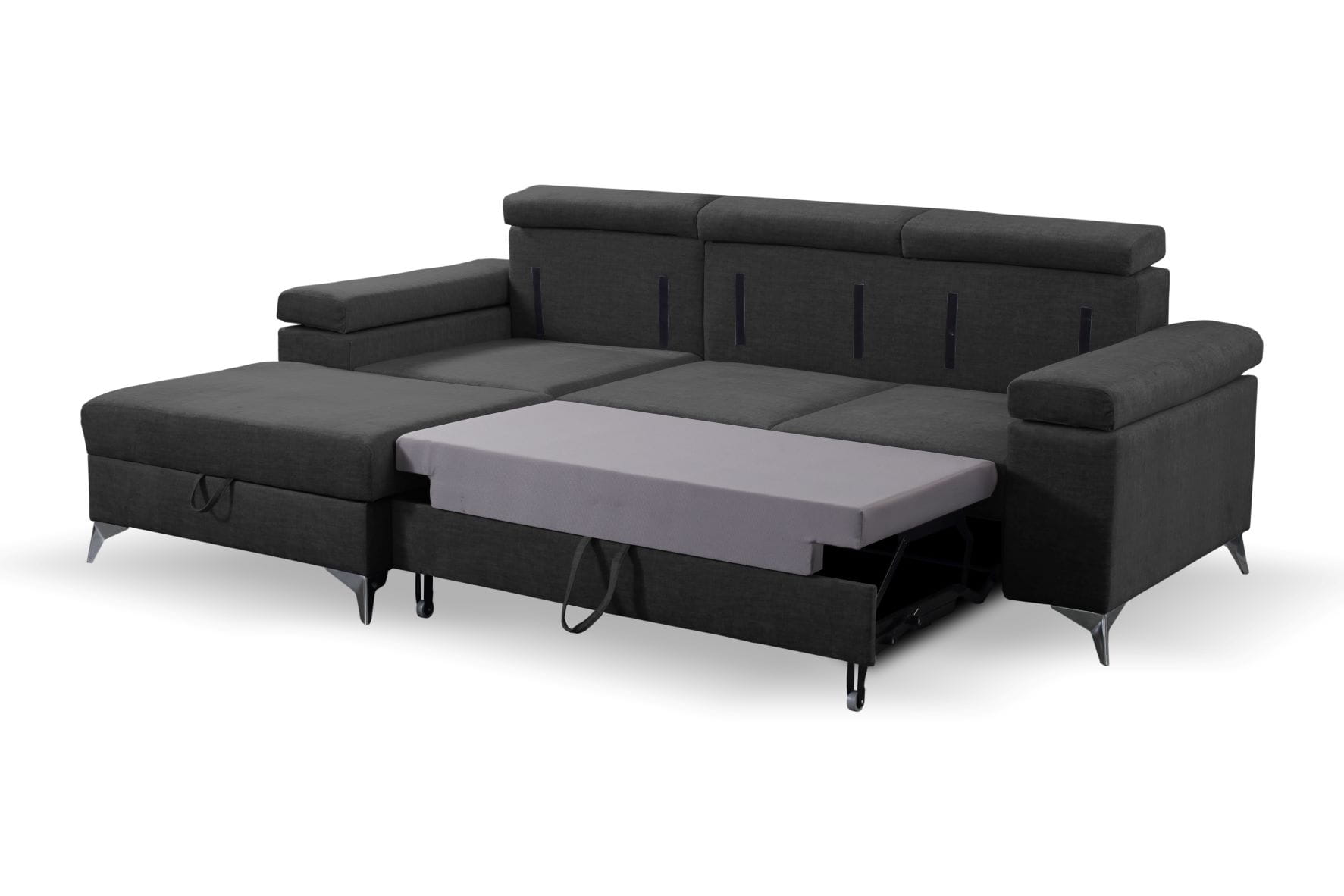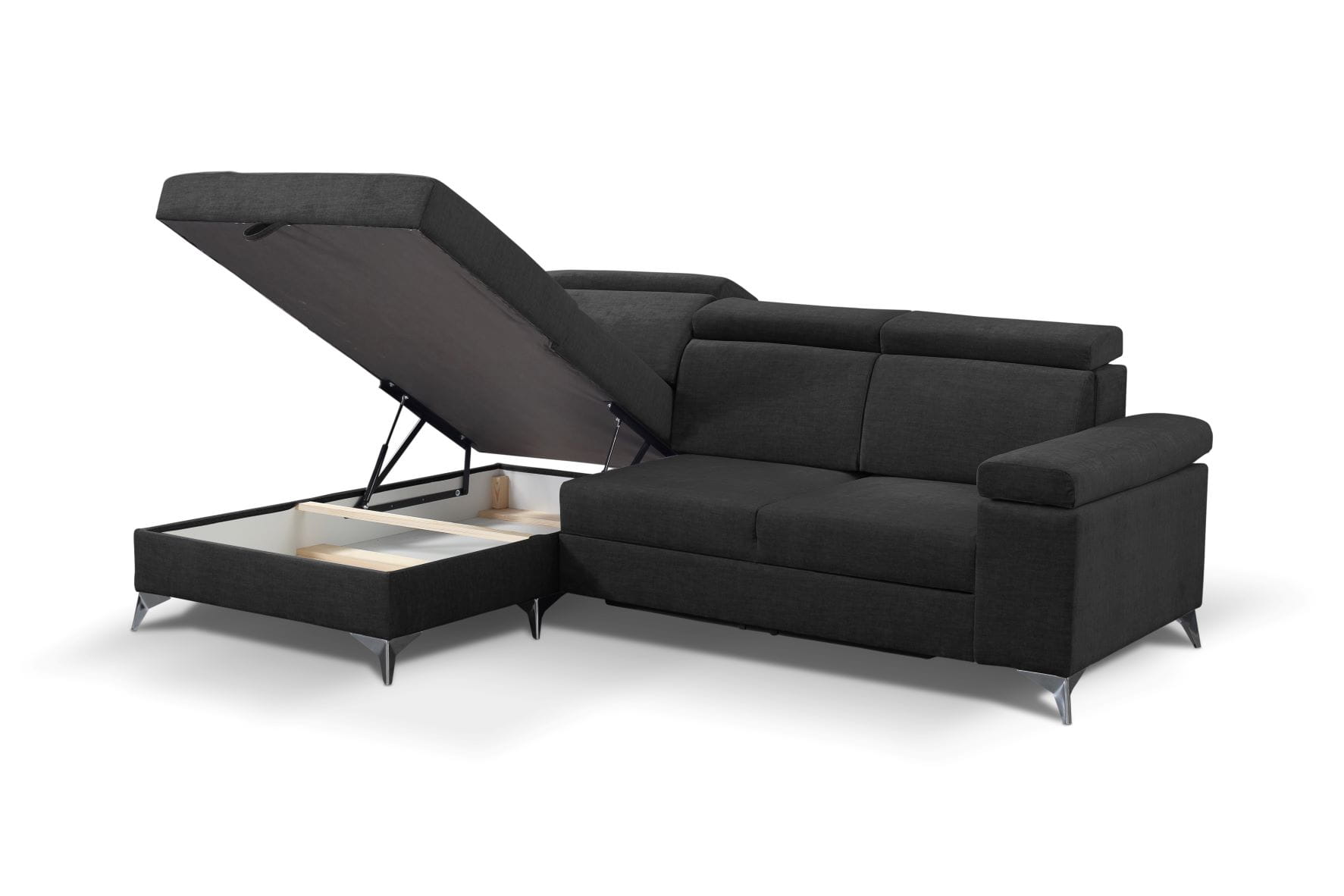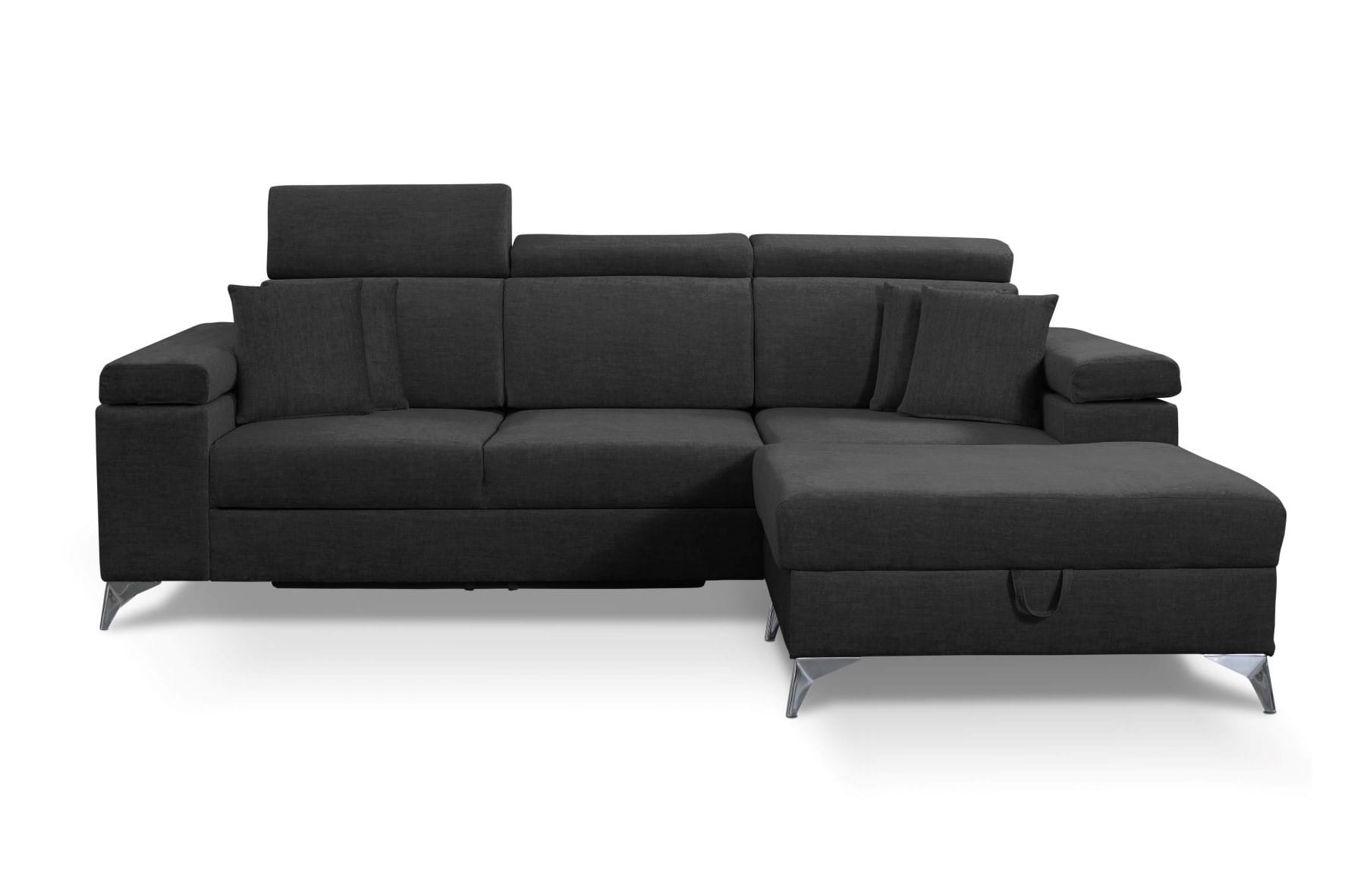 W tak nowoczesnej sofie nie mogło zabraknąć dużego pojemnika na pościel czy drobiazgi.