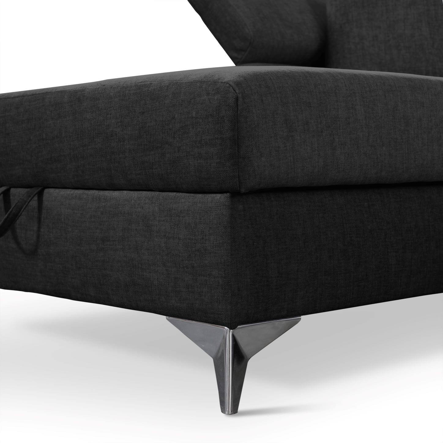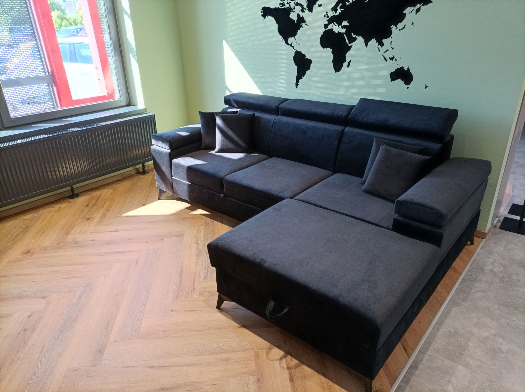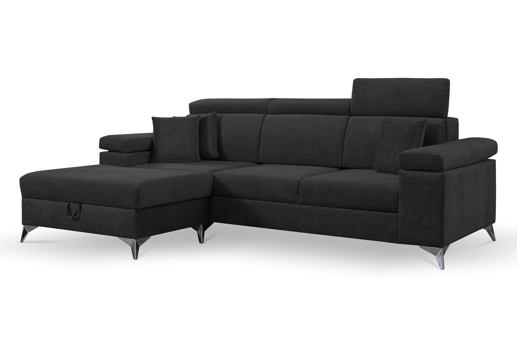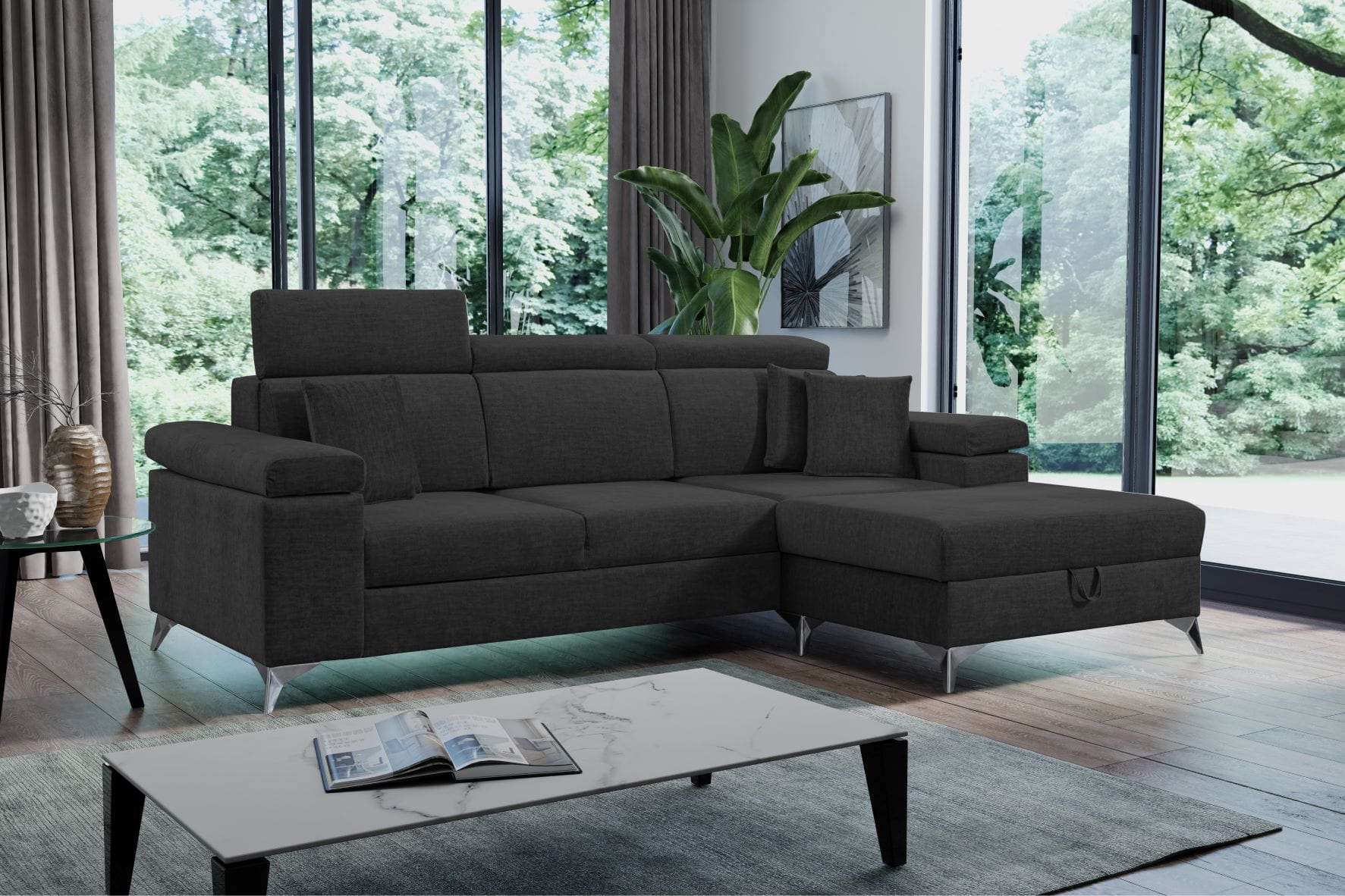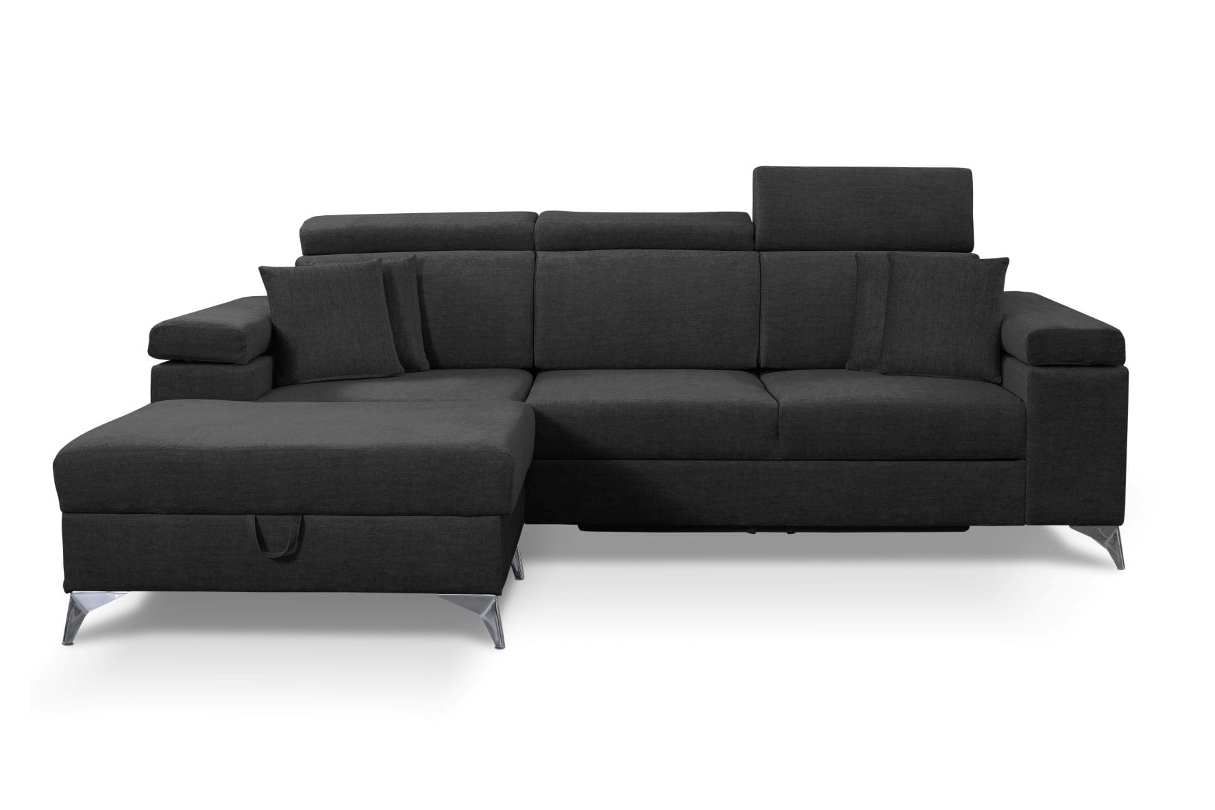 W tak nowoczesnej sofie nie mogło zabraknąć dużego pojemnika na pościel czy drobiazgi.