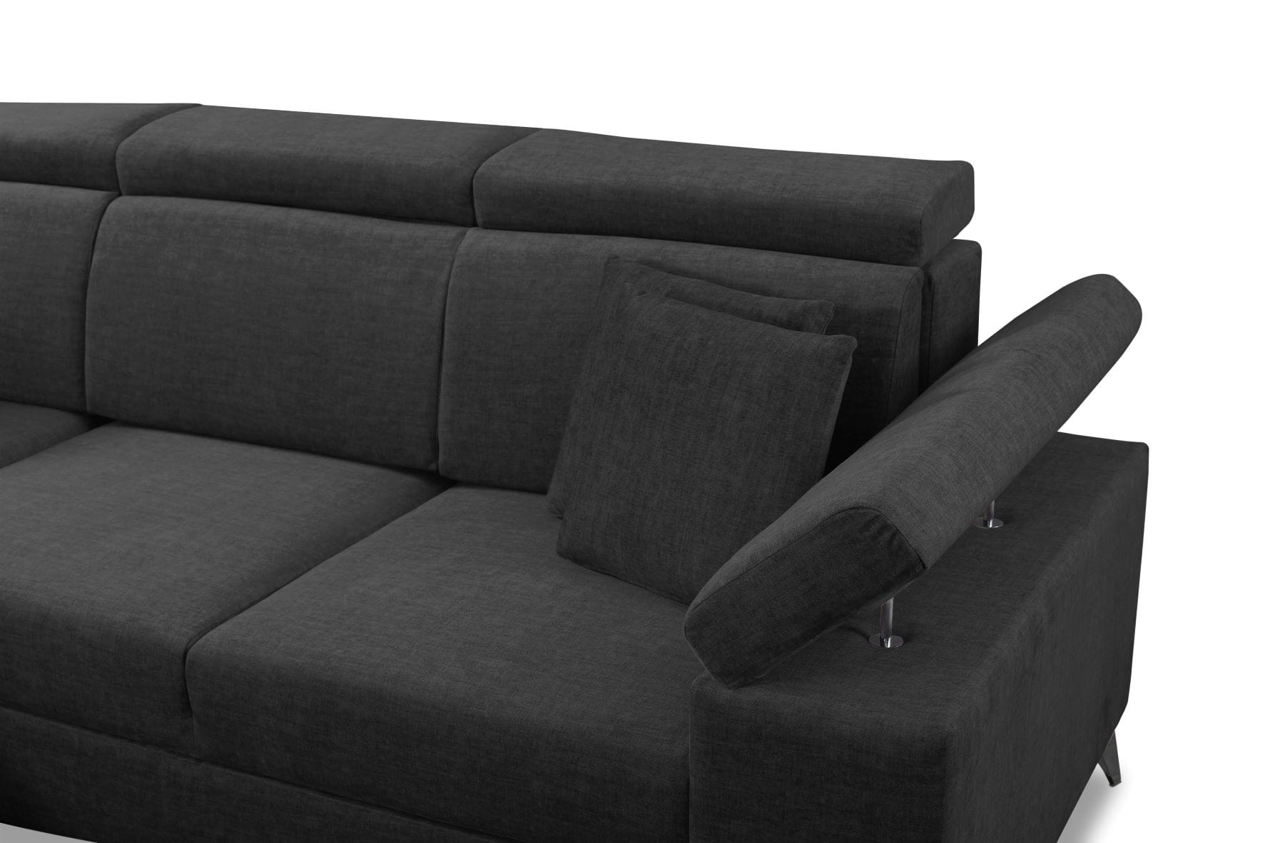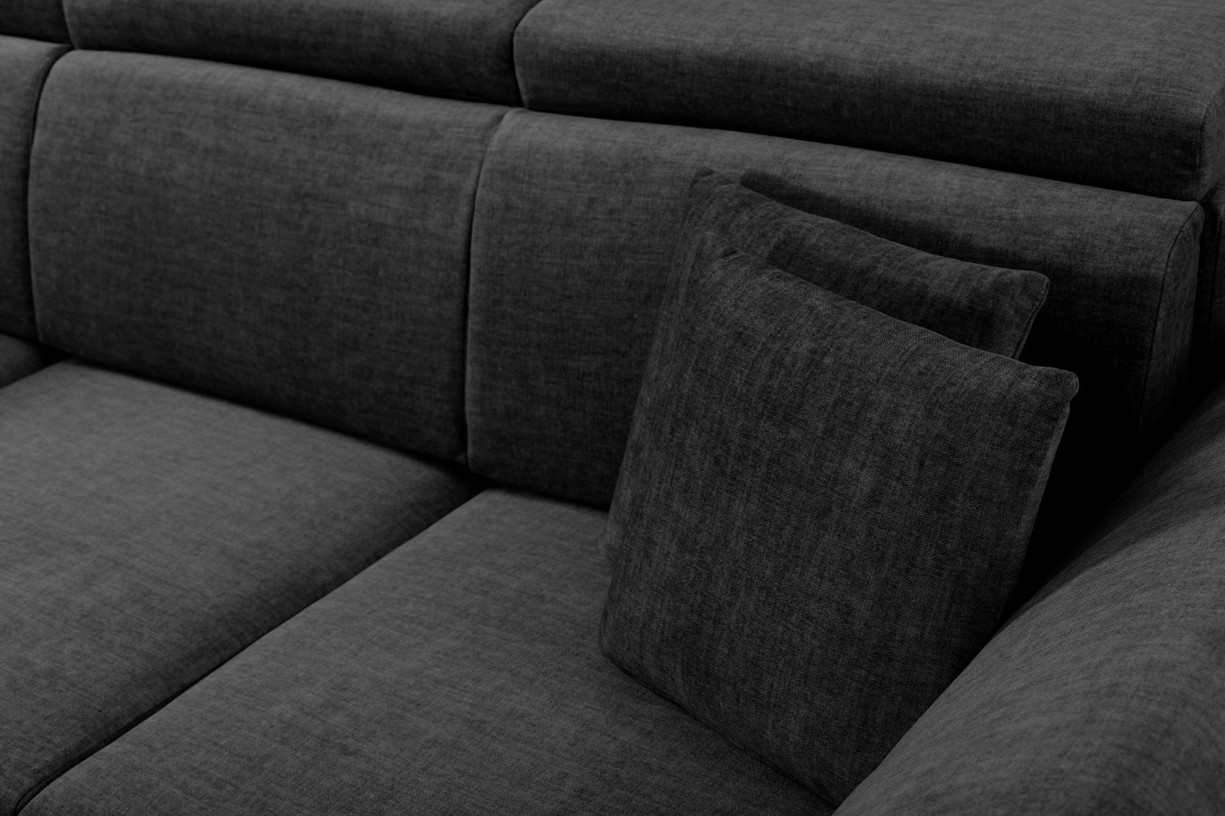 Oparcie mebla to poduszki profilowane wypełnione pianką T30, funkcja relaks w kanapie to trzy regulowane zagłówki oraz dwa regulowane podłokietniki.