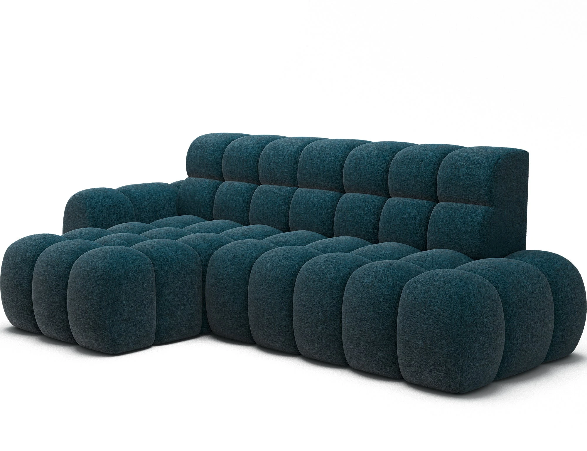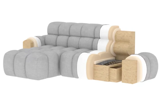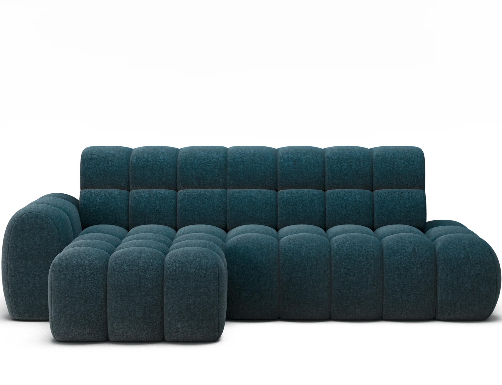 Solidna konstrukcja narożnika w kształcie L oparta jest na sprężynach falistych oraz piance HR, uzupełnionej piankami T2315 i T2540, co gwarantuje trwałość i odporność na odkształcenia nawet przy intensywnym użytkowaniu. Zmienna głębokość siedziska oraz ergonomiczne oparcie zapewniają wygodną pozycję zarówno do siedzenia, jak i leżenia. W pełni tapicerowany tył umożliwia ustawienie narożnika również na środku salonu, a niskie, czarne nóżki dodają mu nowoczesnej lekkości.