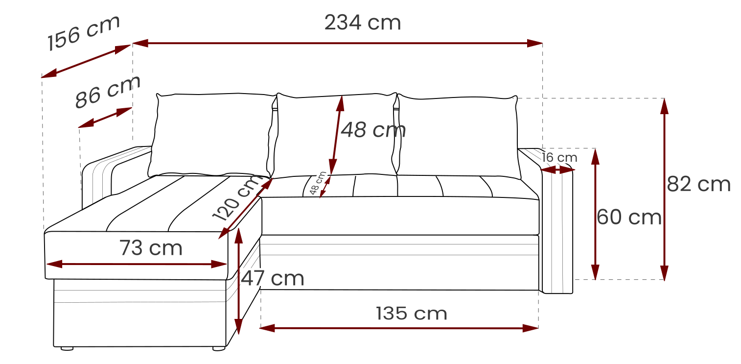 Wymiary narożnika 234 x 156 cm pozwalają na zaaranżowanie narożnika w mniejszym salonie jednocześnie zapewniają dużą przestrzeń do wypoczynku dla całej rodziny.