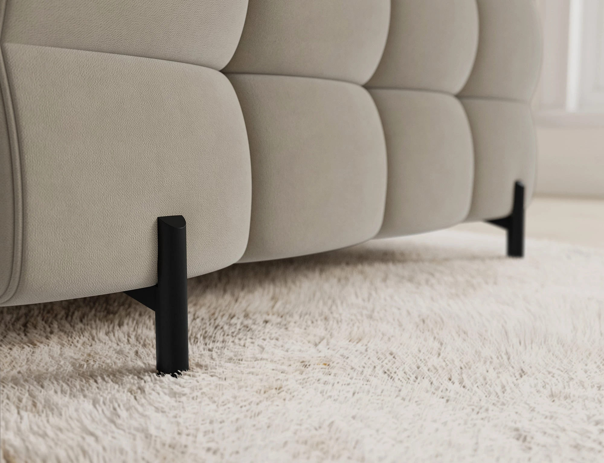 Funkcja spania typu Delfin pozwala szybko i łatwo rozłożyć narożnik, tworząc wygodną powierzchnię do spania o wymiarach 123 × 247 cm. Praktyczny pojemnik na pościel oferuje dodatkowe miejsce do przechowywania kołder, poduszek i domowych tekstyliów. Tapicerowany tył umożliwia ustawienie narożnika także na środku pomieszczenia, a metalowe nogi o wysokości 9 cm dodają lekkości i pozwalają na swobodny przejazd robota sprzątającego.