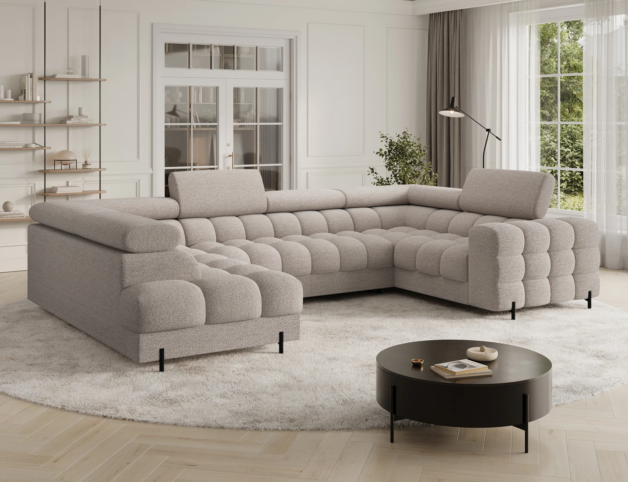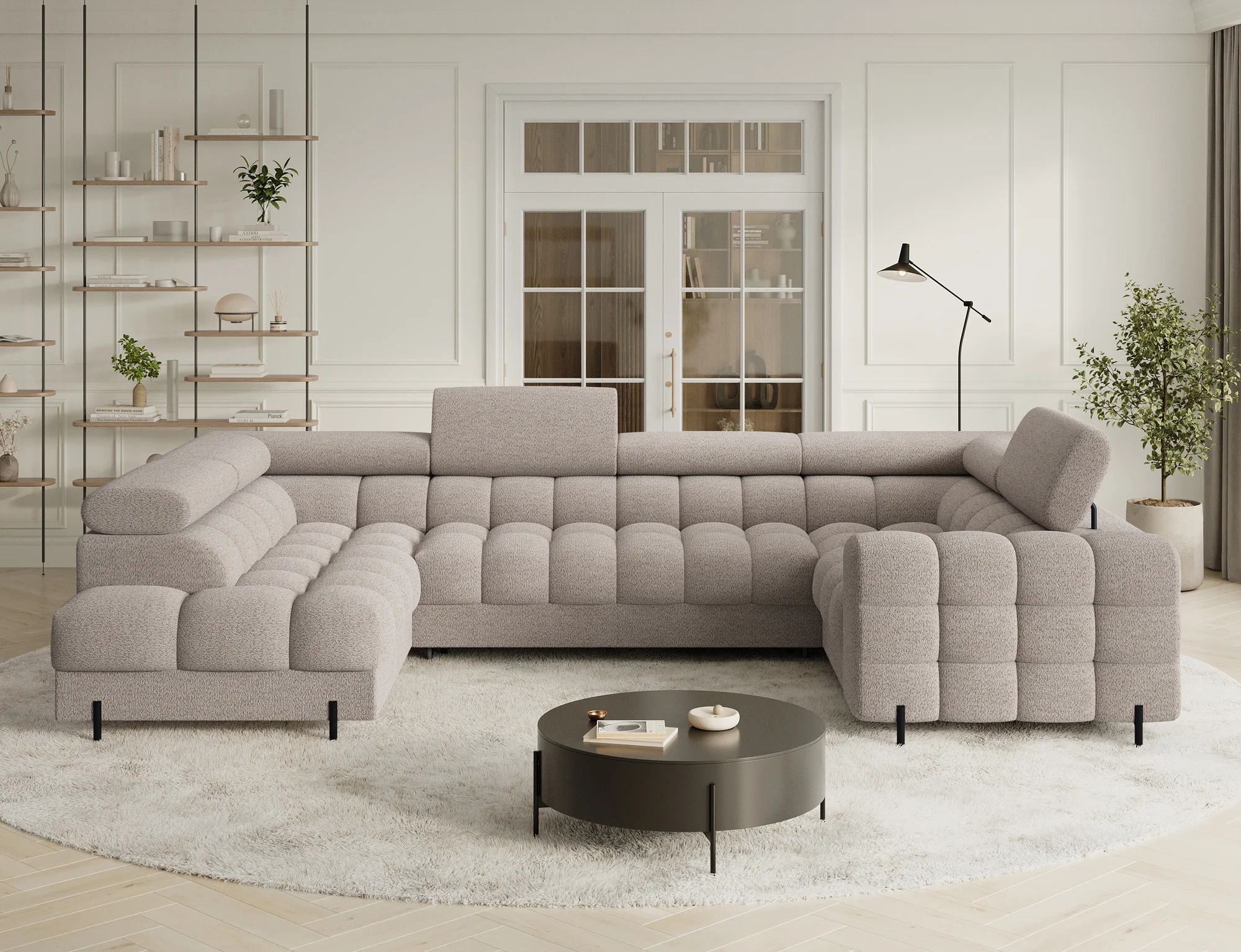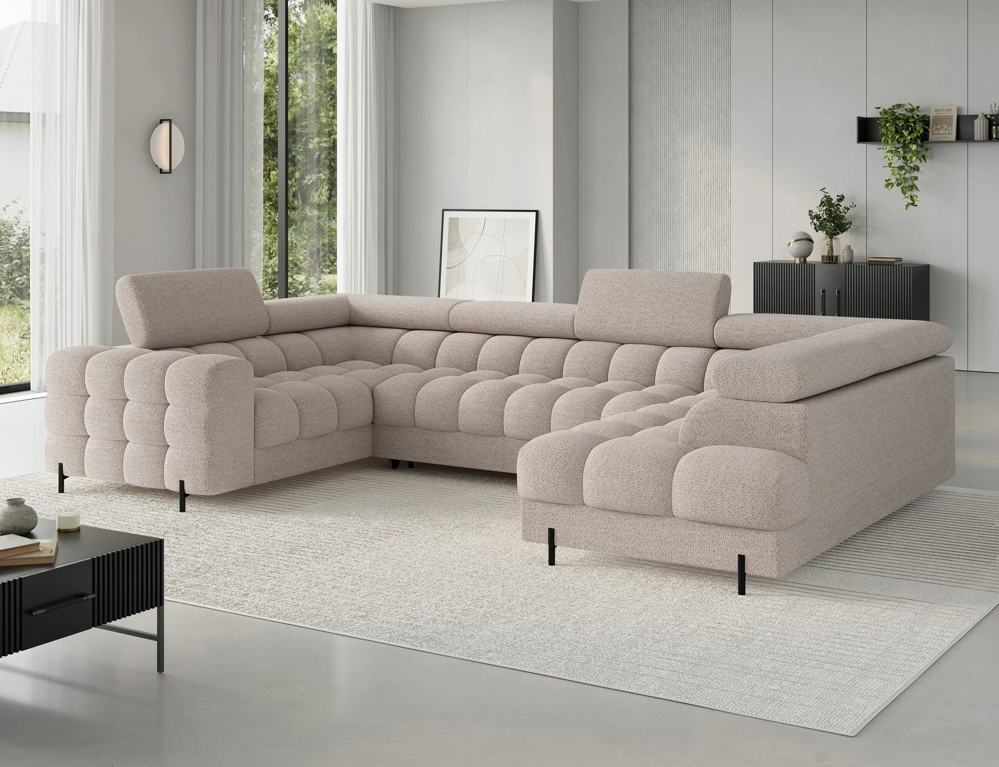 Narożnik z funkcją spania FECTORY to przestronny i komfortowy mebel stworzony z myślą o wspólnym, rodzinnym wypoczynku. Duża bryła w kształcie litery U zapewnia mnóstwo miejsca do siedzenia, relaksu i zabawy, a możliwość wyboru wersji lewej lub prawej pozwala idealnie dopasować narożnik do układu salonu. Miękkie siedziska, dekoracyjne pikowania oraz przytulna forma sprawiają, że FECTORY szybko staje się centralnym punktem wnętrza.